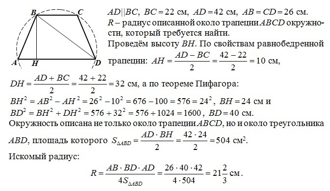 Основи рівнобічної трапеції дорівнюють 22 см і 42 см, а бічна сторона – 26 см. Обчислити радіус описаного кола навколо трапеції.