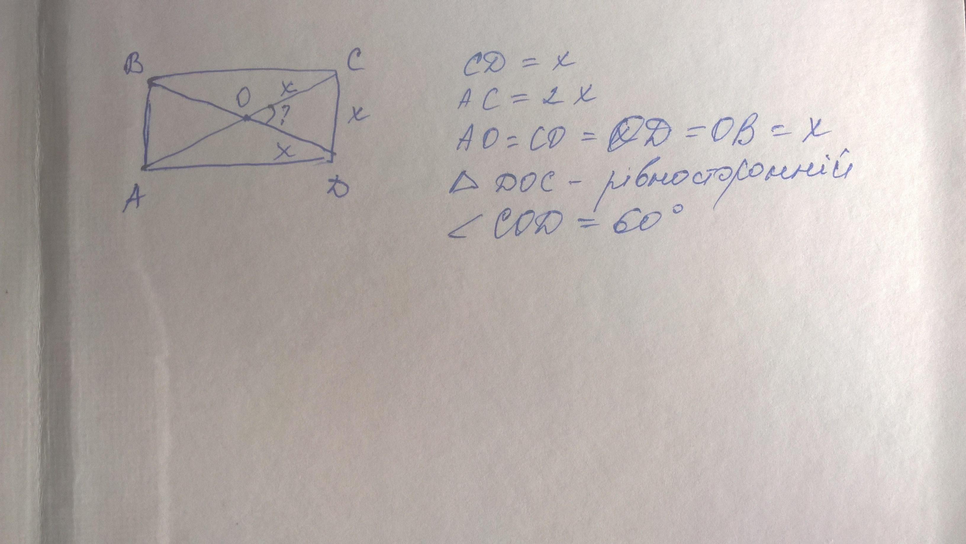 Диагональ прямоугольника в два раза больше одной с его стороны.Найти кут между диагоналями