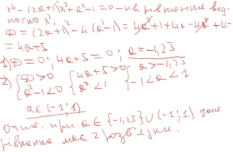 1. При каких значениях параметра а уравнение x^4-(2a+1)x^2+a^2-1=0 имеет два разных действительных корня.
