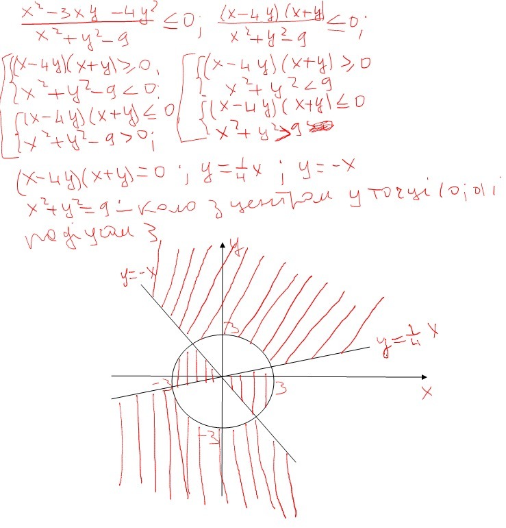2. Построить ГМТ, что удовлетворяют неравенство x^2-3xy-4y^2/x^2+y^2-9 меньше или равно 0.( это задание есть на фото и оно там 12)