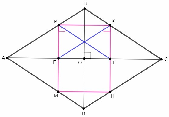 1) Диагонали ромба перпендикулярны, AC⊥BD. Прямые, параллельные перпендикулярным, перпендикулярны*, PM⊥AC, KH⊥AC, PK⊥BD. Смежные стороны EPKT лежат на перпендикулярных прямых, EPKT - прямоугольник. Диагонали прямоугольника равны.
