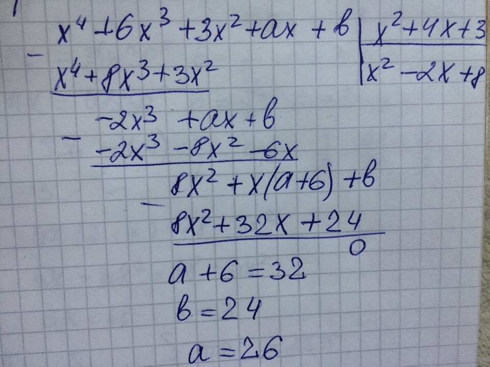 Найдите, при каких значениях a и b многочлен х⁴+6х³+3х²+ax+b делится без остатка на многочлен x²+4x+3