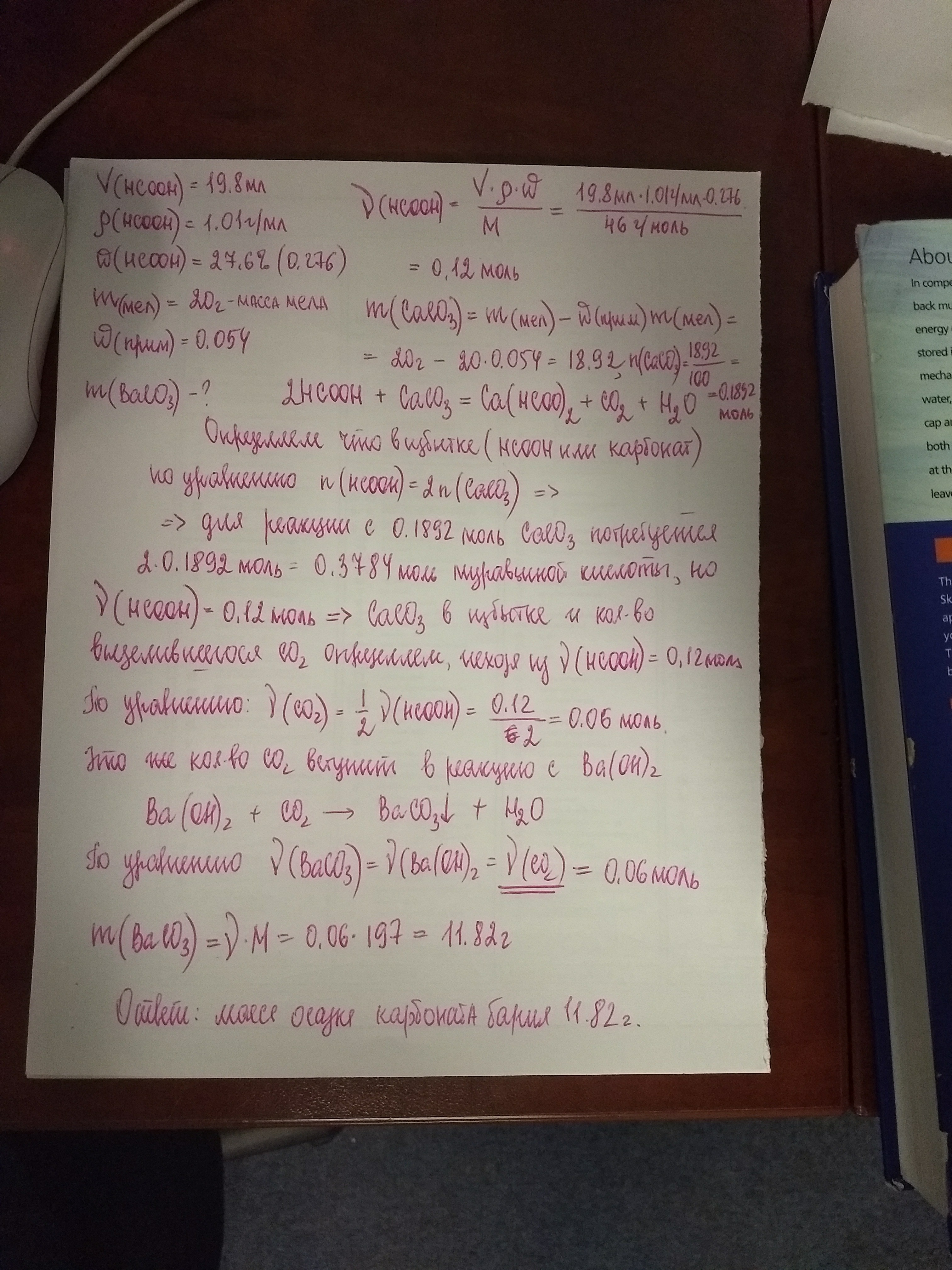 В раствор муравьиной кислоты объемом 19,8 см^3 (плотность раствора 1,01 г/см^3) с массовой долей кислоты 27,6% добавили 20 г мела, содержащего 5,4% примесей. Выделившийся газ пропустили в раствор, содержащий избыток гидроксида бария. Определить массу образовавшегося осадка.