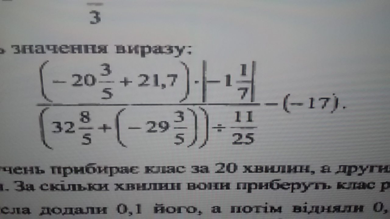 frac{( - 20 frac{3}{5} + 21.7) times | - 1 frac{1}{7} | }{(32 frac{8}{5} + ( - 29 frac{3}{5})) div frac{11}{25} } - ( - 17) = 17 frac{121}{875} <br />\ - - - - - - - - \ 1) : : : - 20 frac{3}{5} + 21.7 = - 20 frac{3}{5} + 21 frac{7}{10} = 21 frac{7}{10} - 20 frac{6}{10} = 1 frac{1}{10} \ 2) : : : 1 frac{1}{10} times | - 1 frac{1}{7} | = frac{11}{10} times frac{8}{7} = frac{11 times 4}{5 times 7} = frac{44}{35} = 1 frac{9}{35} \ 3) : : : 32 frac{8}{5} + ( - 29 frac{3}{5} ) = 3 frac{8 - 3}{5} = 3 frac{5}{5} = 4 \ 4) : : : 4 div frac{11}{25} = frac{4 times 25}{11} = frac{100}{11} = 9 frac{1}{11} \ 5) : : : 1 frac{9}{35} div 9 frac{1}{11} = frac{44}{35} div frac{100}{11} = frac{44 times 11}{35 times 100} = frac{11 times 11}{35 times 25} = frac{121}{875} \ 6) : : : frac{121}{875} - ( - 17) = frac{121}{875} + 17 = 17 frac{121}{875}
