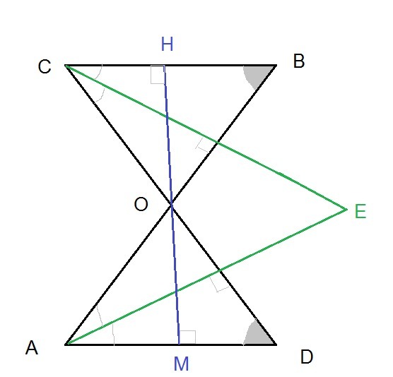 Треугольники ВОС и AOD равны. Значит и высоты OM и OH тоже равны. O- середина MH.