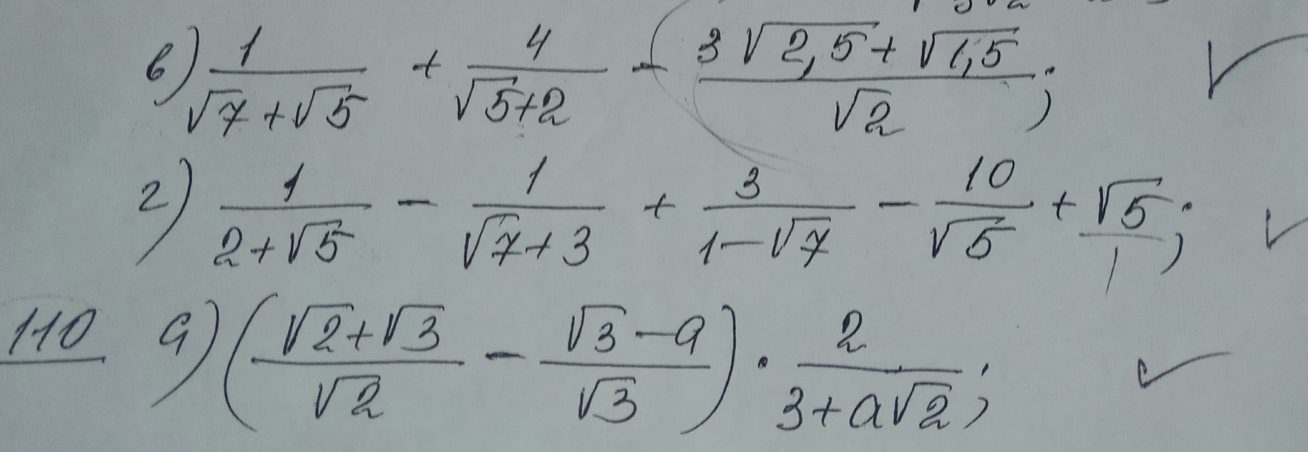 в)1/(√7 + √5) + 4/(√5+2) +(3√2,5+√1,5)/√2=