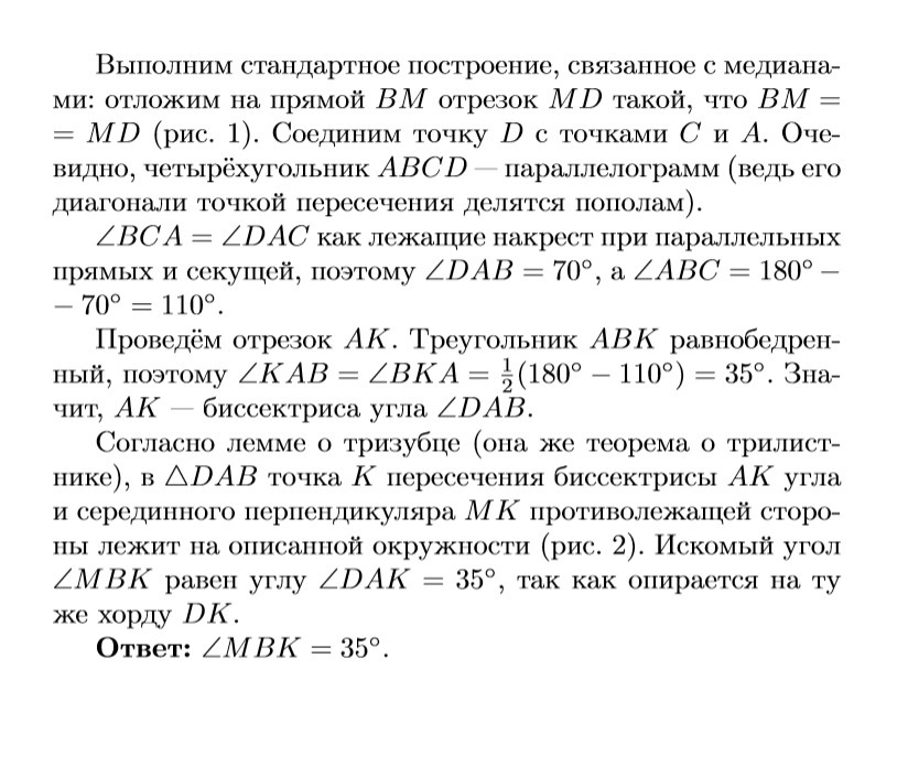 Найдите ∠MBC, если ∠A + ∠C = 70◦