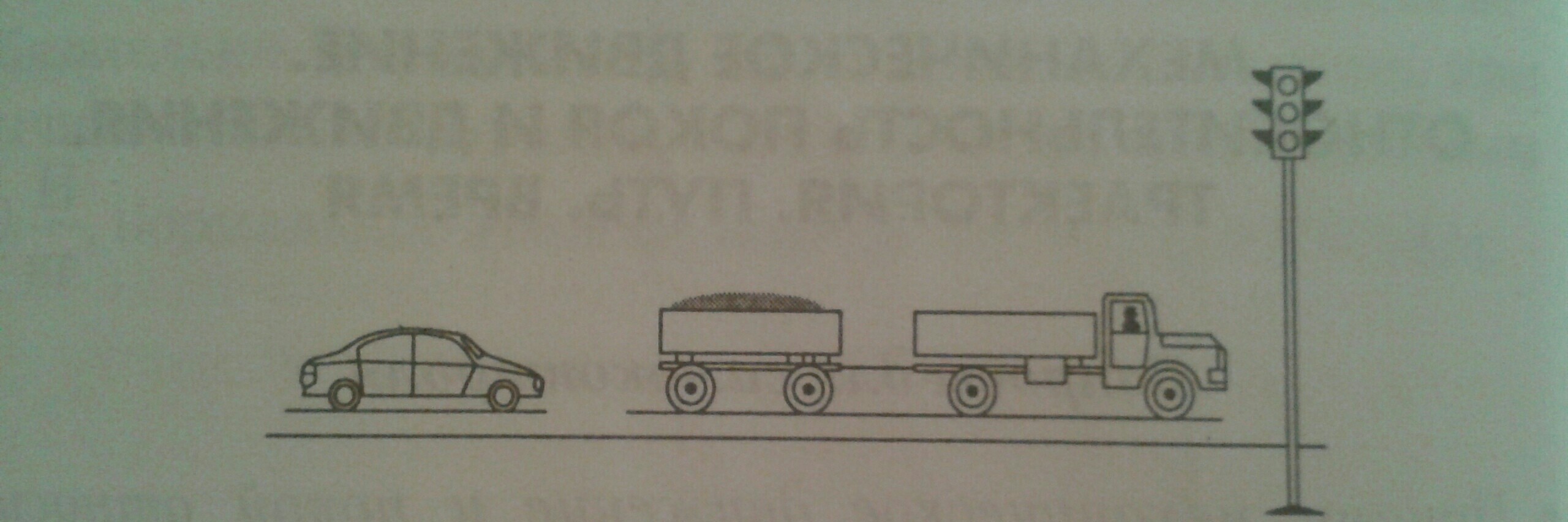 д) да. Так как легковой автомобиль сохраняет постоянную дистанцию от прицепа, то он движется относительно земли со скоростью прицепа в том же направлении. Светофор относительно земли находится в состоянии покоя.
