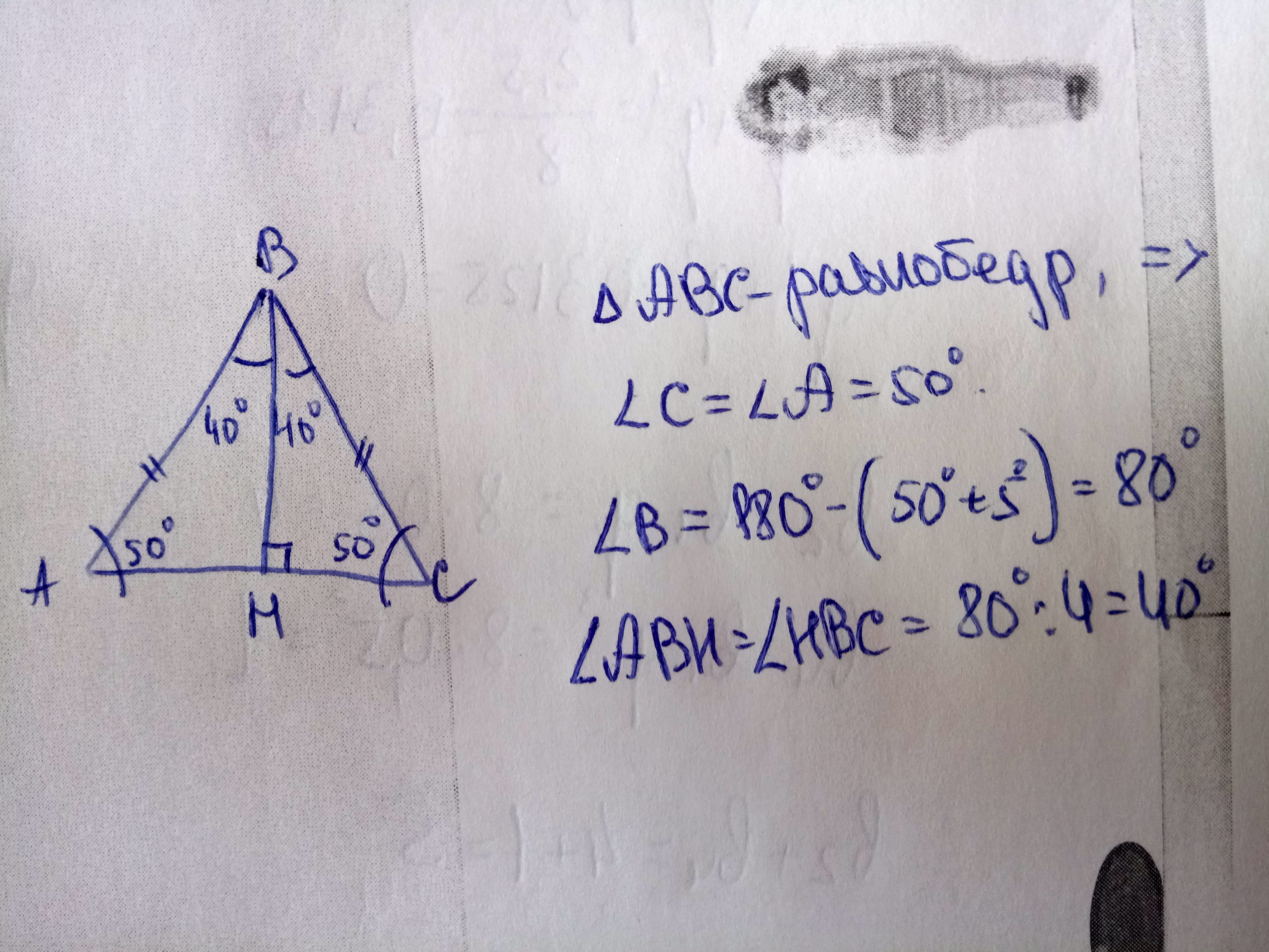 Найдите градусную меру углов, полученных при проведении биссектрисы из вершины равнобедренного треугольника к основанию, если один из углов при основании равен 50 градусов?