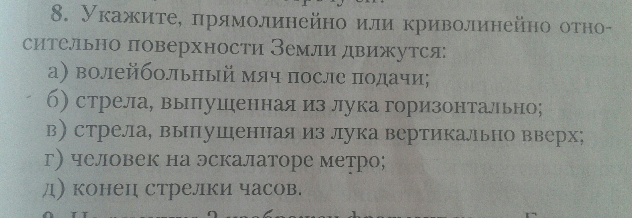 Криволинейно движутся мяч и стрела в б). У их начальных скоростей есть горизонтальная и вертикальная составляющие. Вертикальная меняется из-за силы тяжести, меняется величина и направление результирующей скорости.