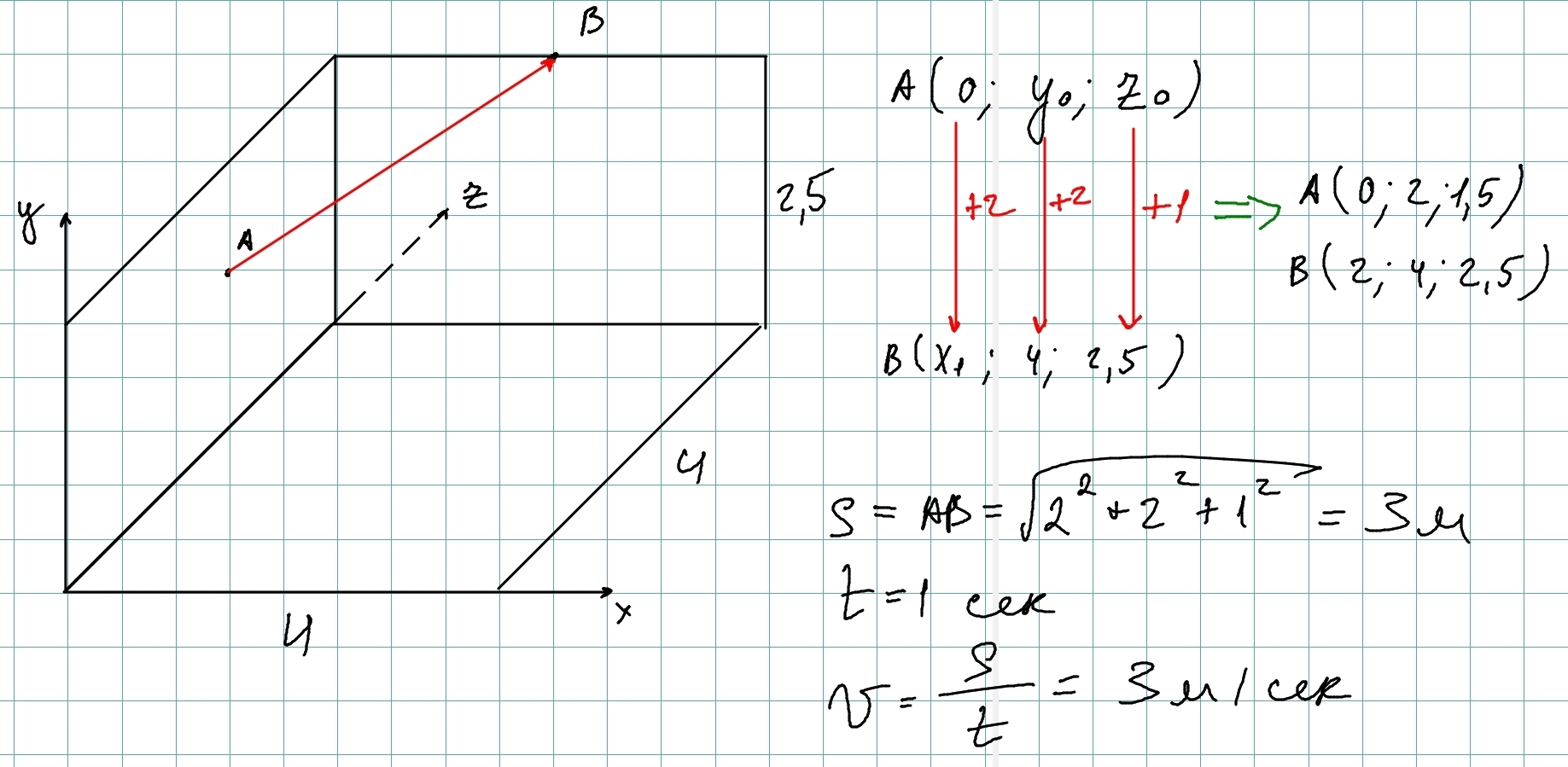 Через открытое окно в комнату влетел жук. Расстояние от жука до потолка менялось со скоростью 1 м/с, до задней стены комнаты - 2 м/с, до боковой стены -2 м/с. Через 1 с жук ткнулся в угол между потолком и боковой стеной комнаты. Определите скорость полета жука и место в окне, через которое жук влетел в комнату. Высота комнаты 2,5 м, ширина 4 м, длина 4 м.