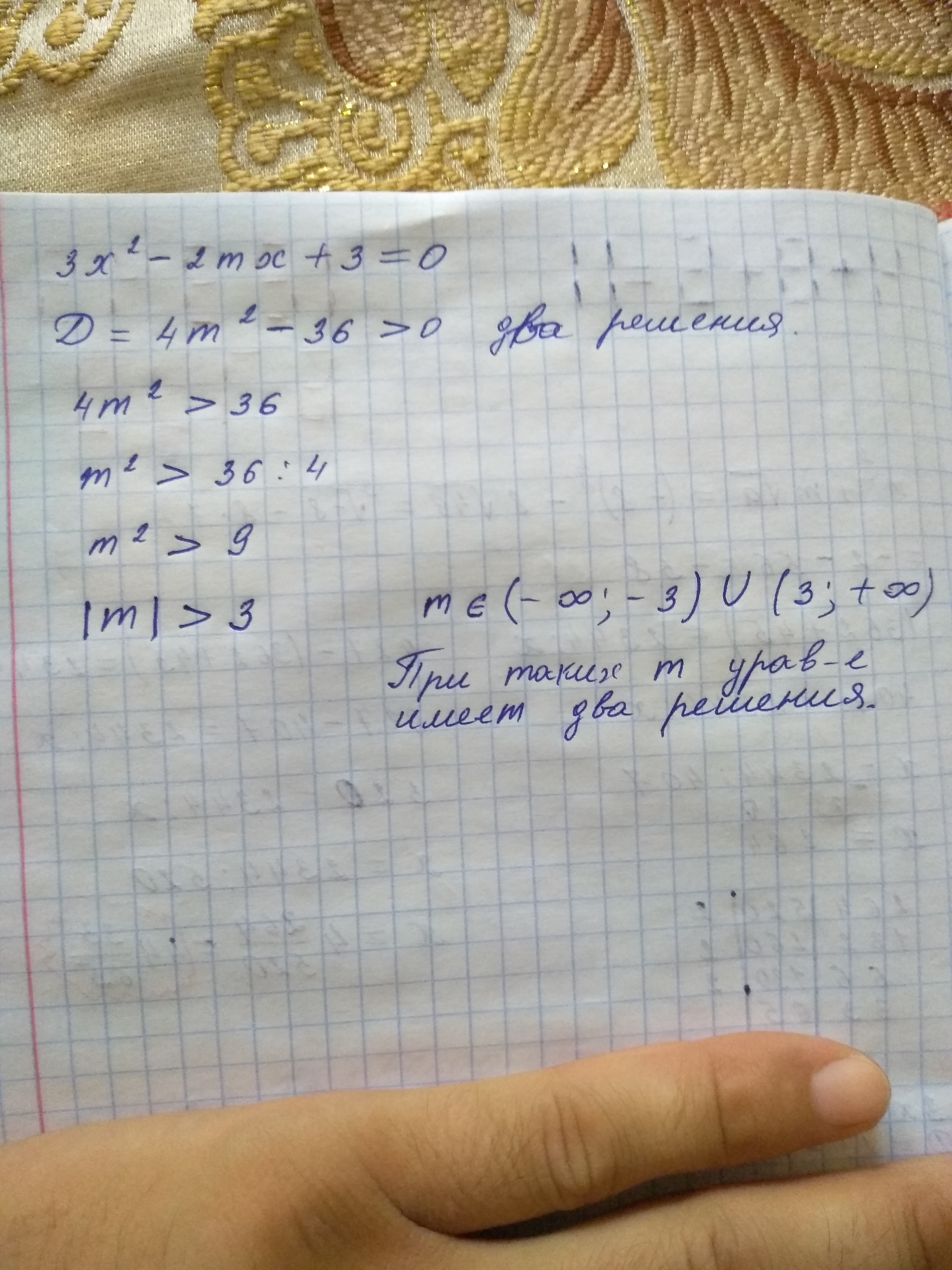 Здравствуйте помогите пожалуйста очень срочно) При каких значениях m уравнение 3x^2-2mx+3=0 имеет два различных корня ?