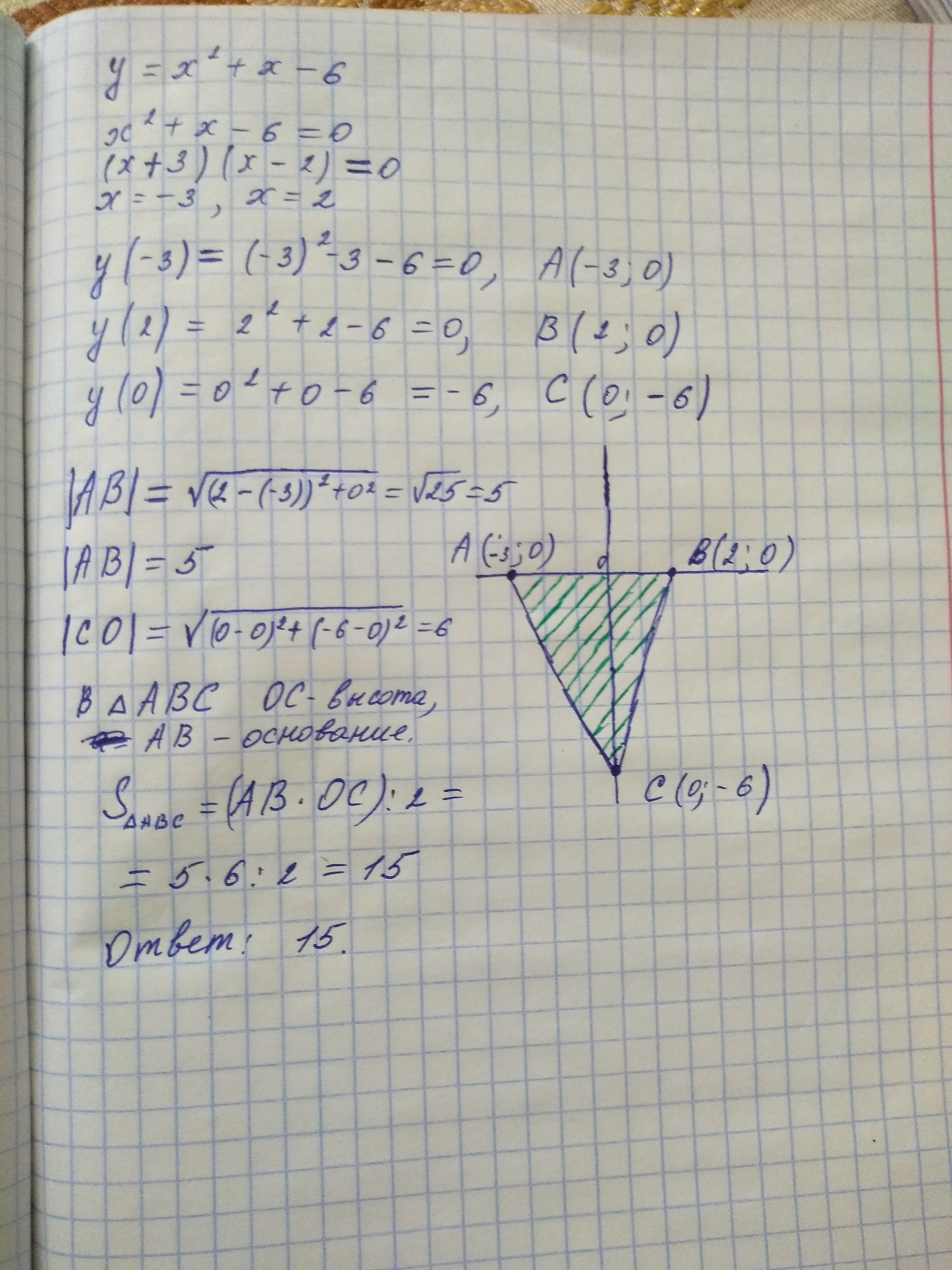 Здравствуйте помогите пожалуйста с задачей) Парабола у=x2+x-6 пересекает оси координат в точках a b c. Вычислить площадь треугольника ABC