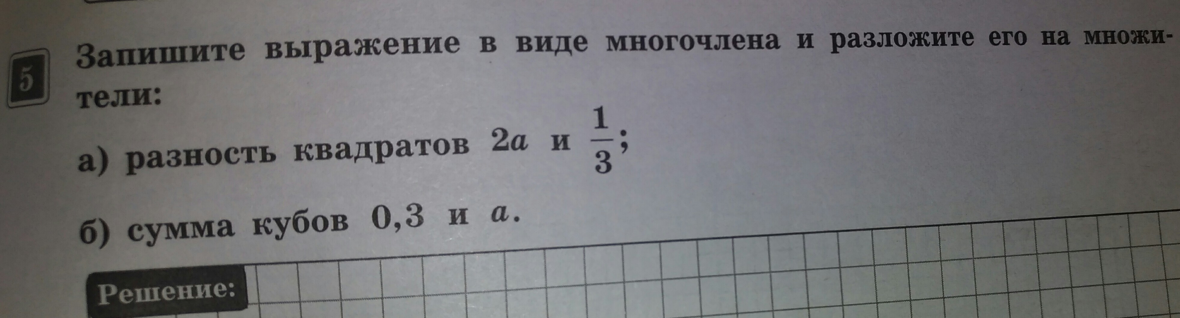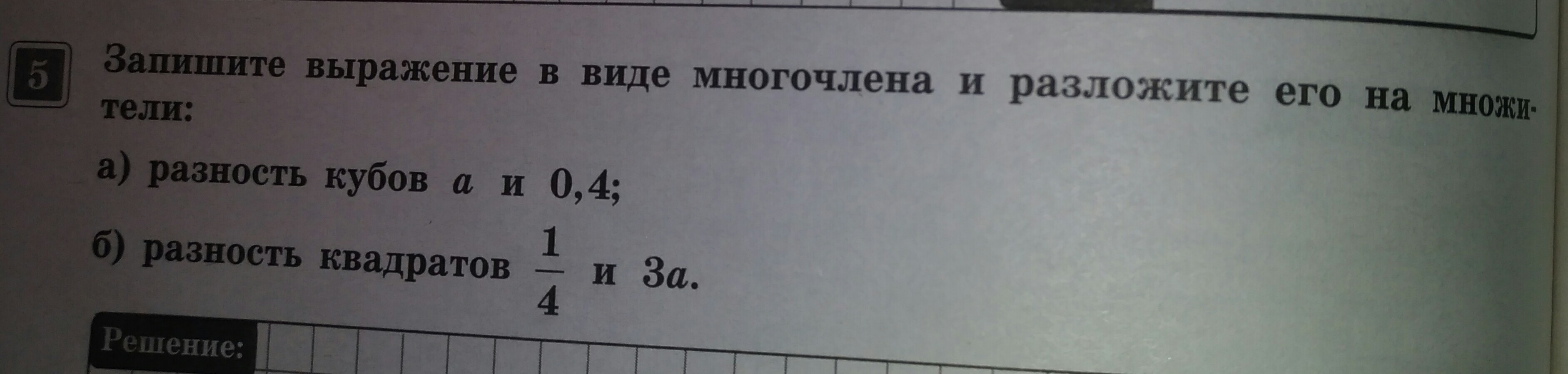5. а) a³ - 0,4³ = (a - 0,4)*(a² + 0,4a + 0,4²) = (a - 0,4)(a² + 0,4a + 0,16)