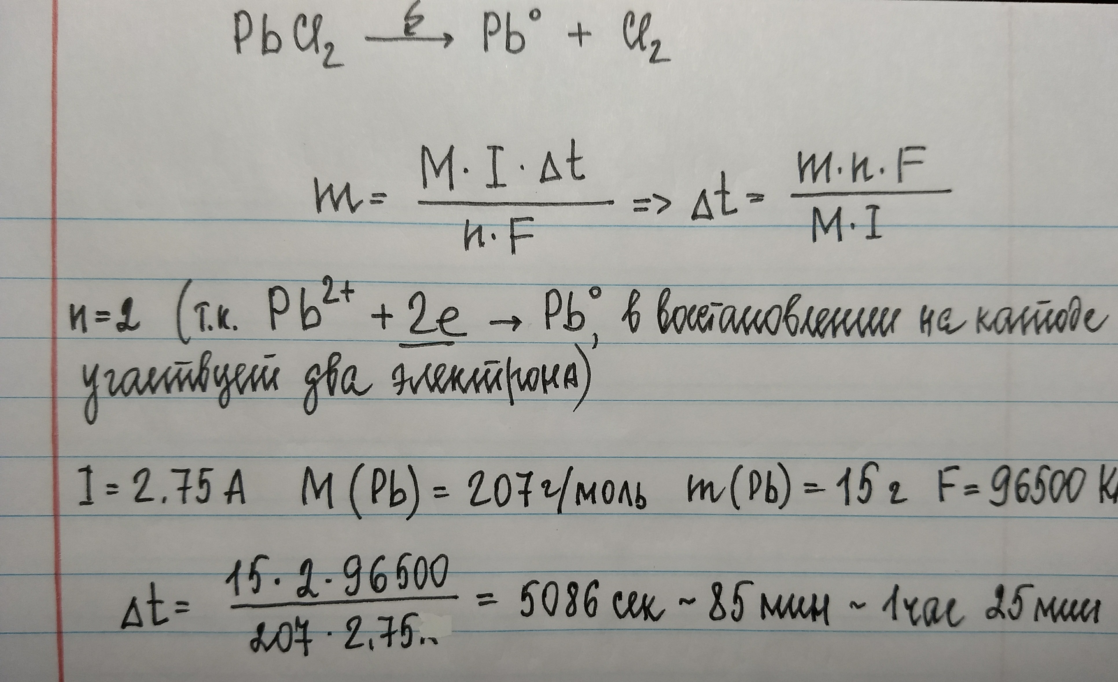 Сколько часов необходимо пропускать ток силой привет 2,75 А чтобы получить 15 г свинца при электролизе расплава хлорида свинца