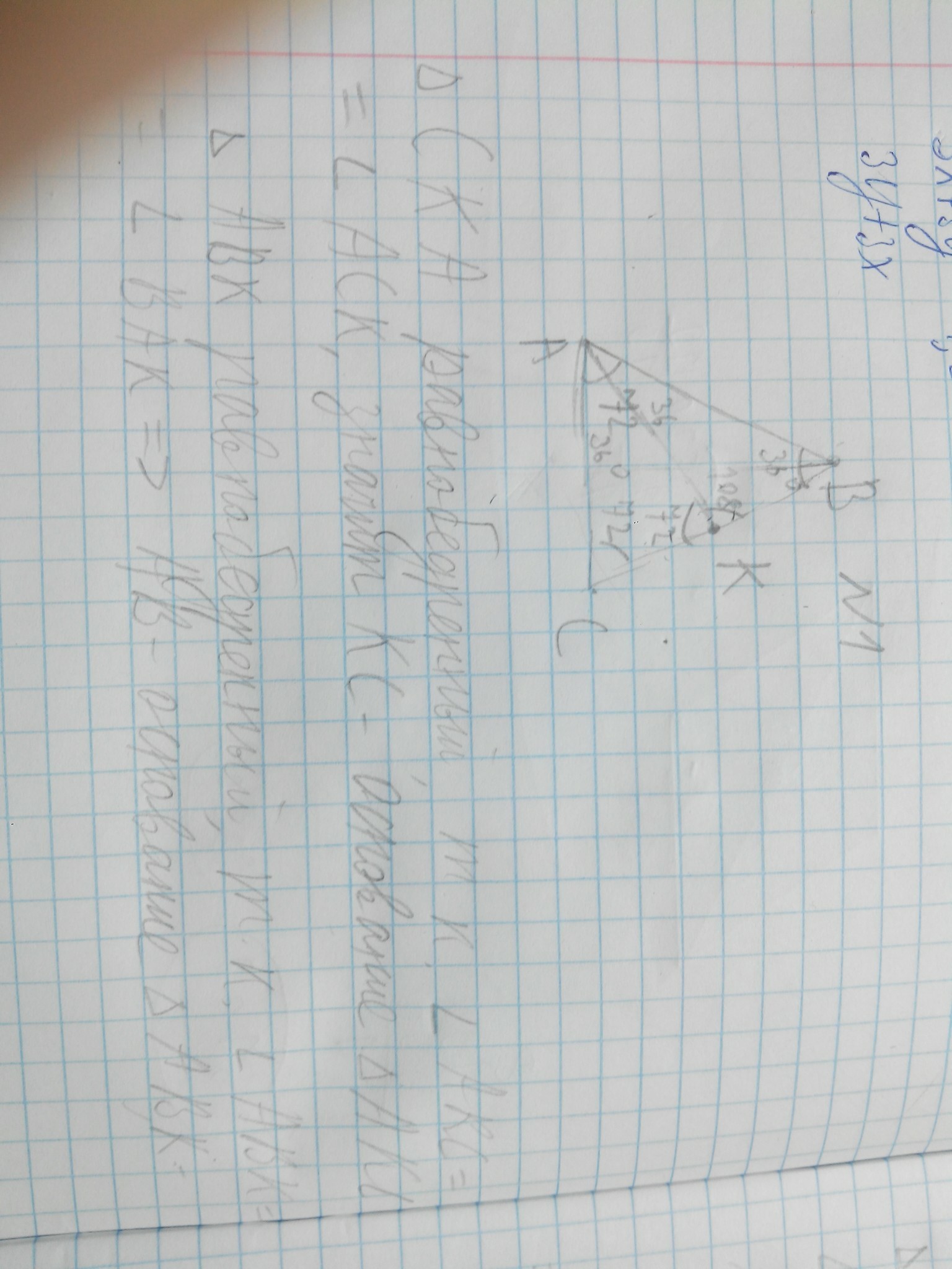 8. В равнобедренном треугольнике АВС с основанием АС и углом при вершине В, равным 36*, проведена биссектриса АК. Докажите, что треугольники СКА и АКВ равнобедренные. 9. В равнобедренном тругольнике АВС с основанием АС проведена медиана ВМ. На ней взята точка О. Докажите равенство тругольников АМО и СМО. 10. В треугольнике АВС медиана ВD является биссектрисой треугольника. Найдите периметр треугольника АВС, если периметр треугольника ABD равен 16 см, BD=5см.