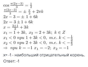 Найдите корень уравнения : cos*π(2x-3)/3=1/2. В ответе запишите наибольший отрицательный корень.