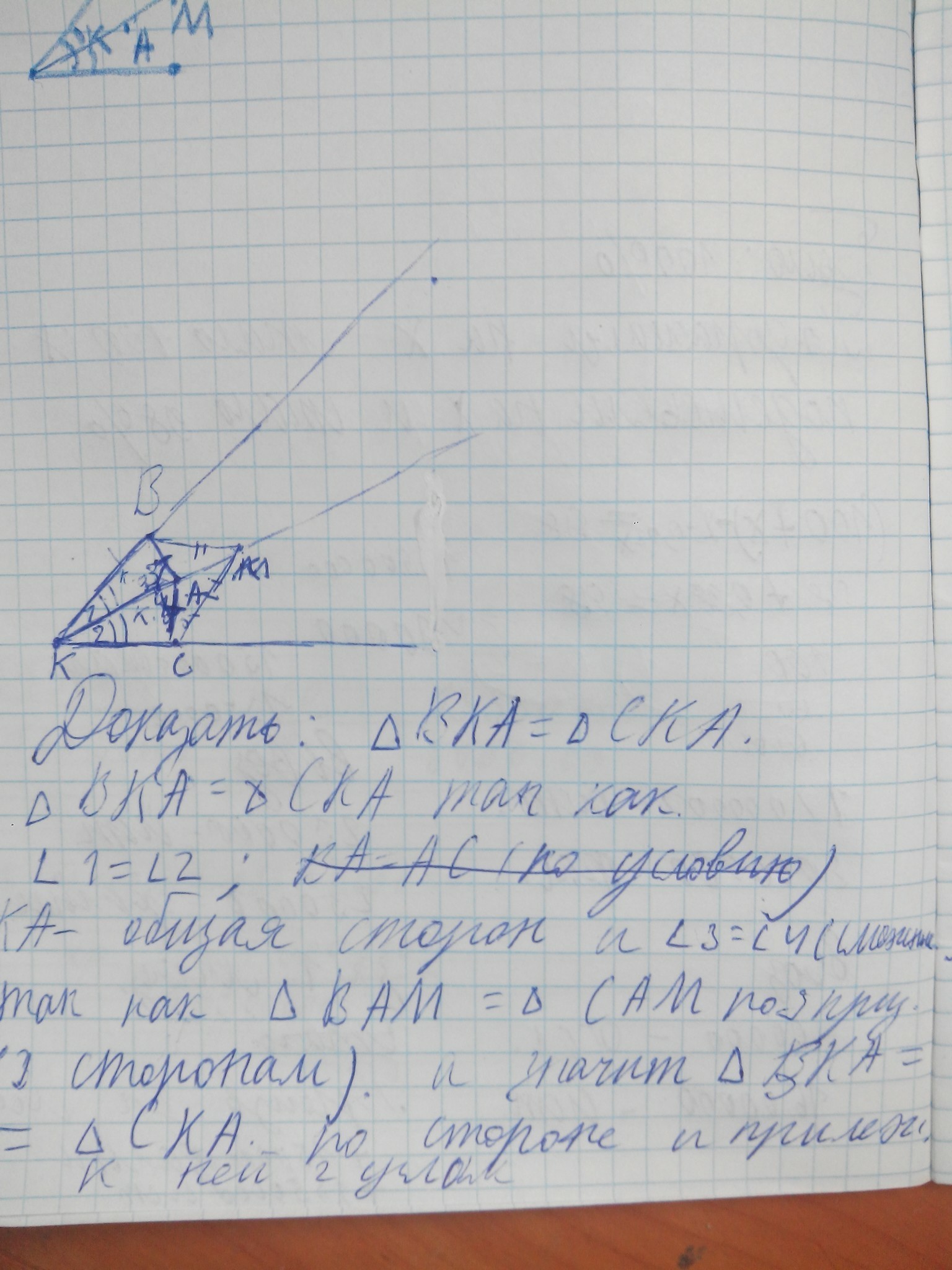 На биссектрисе угла К отложено отрезки КА и КМ, причем КМ> КА, а на сторонах угла К взято точки В и С так, что ВА = АС, ВМ = МС. Докажите, что ΔВКА = ΔСКА.