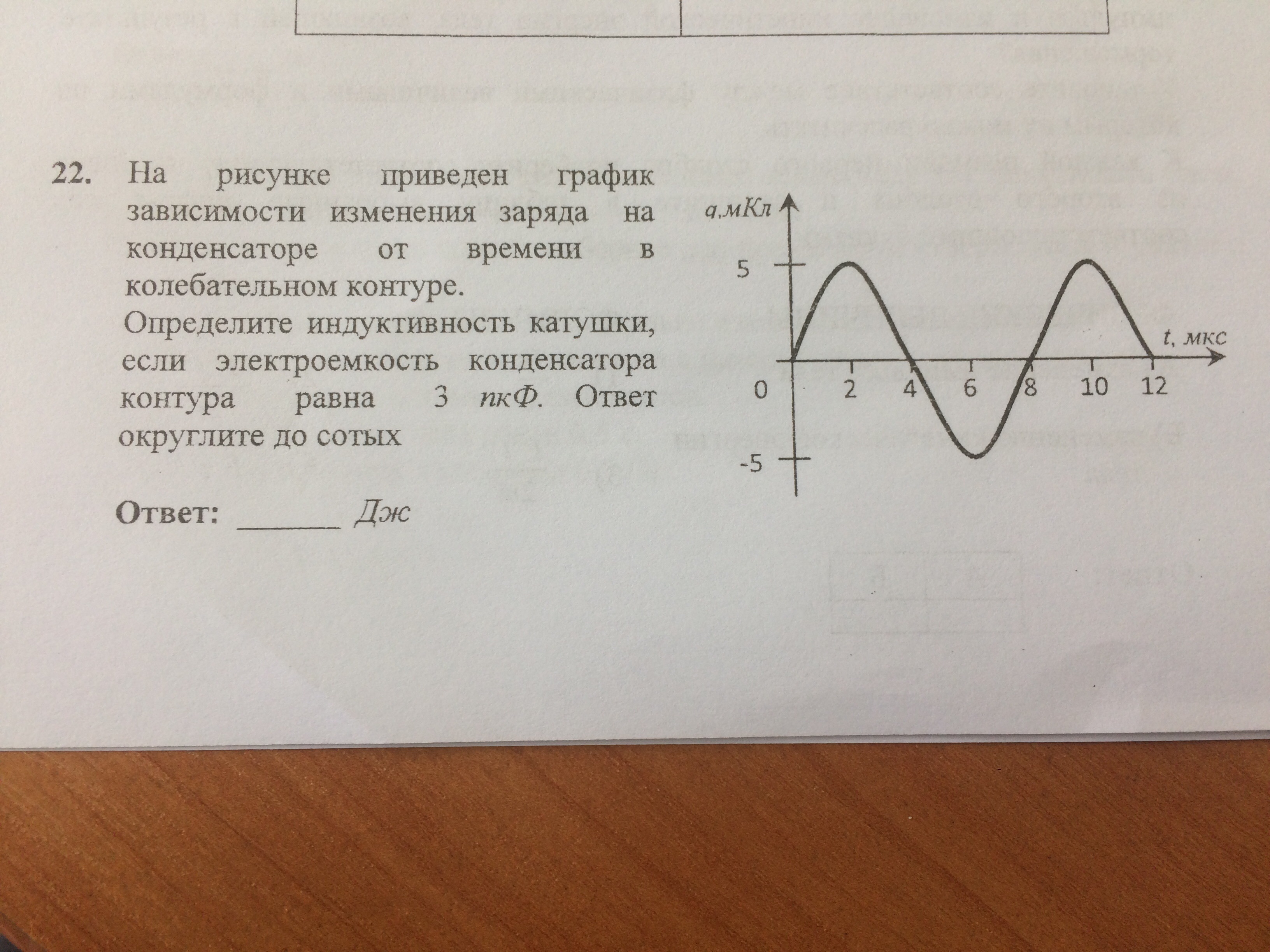 Задача абсолютно абсурдная. Просят определить индуктивность - в ответе ед. измерения Дж. Опечатка? Ладно. Хм.. Давайте вычислим напряжение на конденсаторе: U = q/C = *1.66 миллиарда вольт, найс*. Перестаем уважать себя и считаем индуктивность из формулы T=2pi*sqrt(LC), получаем 0.54 * 10^-4 (Гн - Генри). Округлять до сотых ничего не приходится, выйдет 0. А может они имели ввиду энергию катушки? Ок. Считаем, что нужно найти максимальную энергию. W = (LI^2)/2 = q^2/2C = *примерно 4000000 Дж, катушка, что надо!*