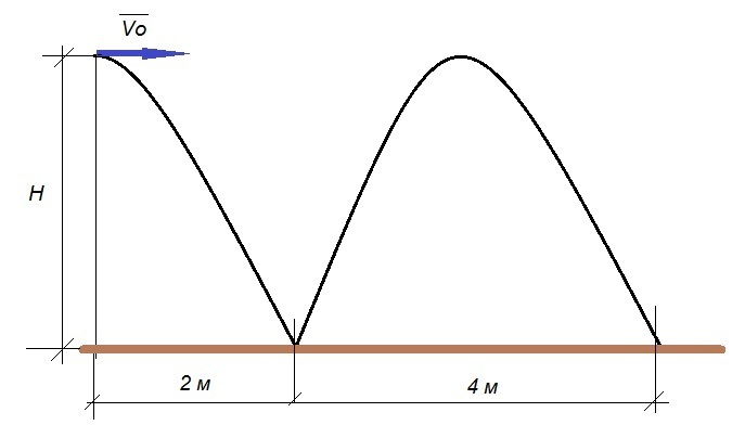 Горизонтальная скорость всегда постоянна. То есть если при скорости в 2 м/с мяч преодолевает 4 м, он затрачивает 2 сек. Из этого следует, что мяч достигает высшей точки за 1 сек. v = v0 - gt; vo - 10 = 0; (Это в высшей точке) vo = 10 м/с; - это скорость мяча на момент падения на землю. По закону сохранения энергии: mgh = (mv^2)/2, откуда h = (v^2)/2g = 100/20 = 5 м.