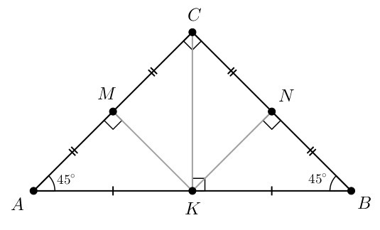 В равнобедренном треугольнике высота, опущенная на основание, является также и медианой, поэтому AK=KB (см. рисунок). В прямоугольном треугольнике медиана, опущенная на гипотенузу, равна её половине, поэтому CK=AK=KB. Следовательно, треугольники ACK и CBK тоже равнобедренные. Это значит, что MK и NK являются и высотами, и медианами. Следовательно, это средние линии треугольника ABC (ведь они проходят через середины двух сторон и параллельны третей).