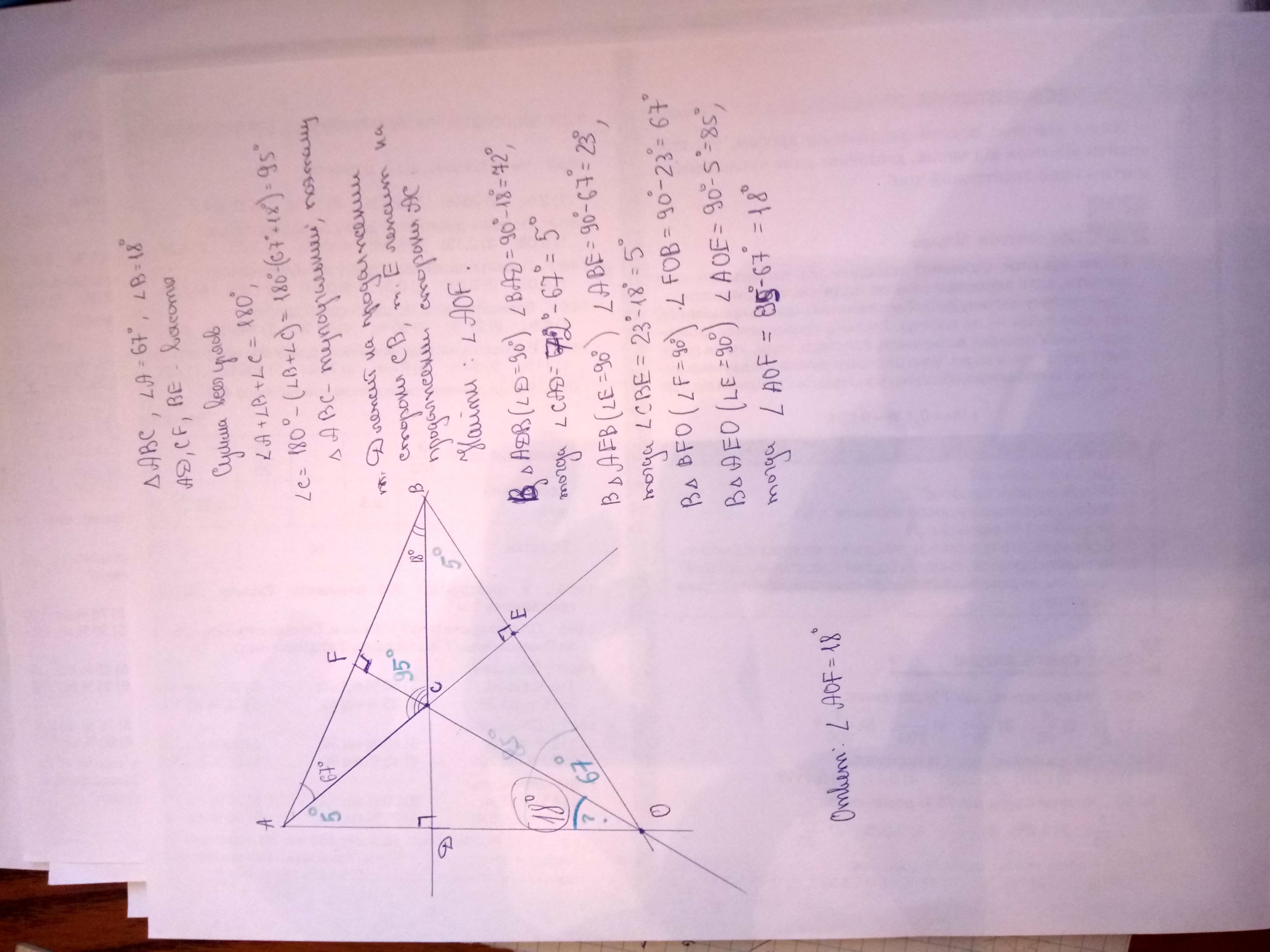 В треугольнике ABC угол A равен 67°, угол B равен 18°. AD, BE и CF — высоты, пересекающиеся в точке O. Найдите угол AOF. Ответ дайте в градусах.