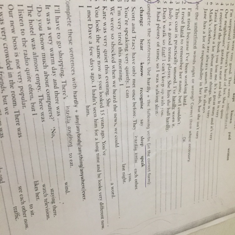 1 I am tired because I've been working hard. OK2 I tried to remember her, name but I couldn't. OK3 This coat is practically unused. I have hardly worn it. OK4 Judy is a good tennis player. She hits the ball HARD.5 Don't walk so fast! I can't keep up with you.6 I had plenty of time, so I was walking SLOWLY. 2 You're speaking very quietly. I can hardly hear you. 3 I'm very tired this morning. I hardly slept last night. 4 We were so shocked when we heard the news , we could hardly speak. 5 Kate was very quiet this evening. She hardly said a word. 6 You look the same now as you looked 15 years old. You've hardly changed. 7 I met Dave a few days ago. I hadn't seen him for a long time and he looks very different now. I hardly recognized him.