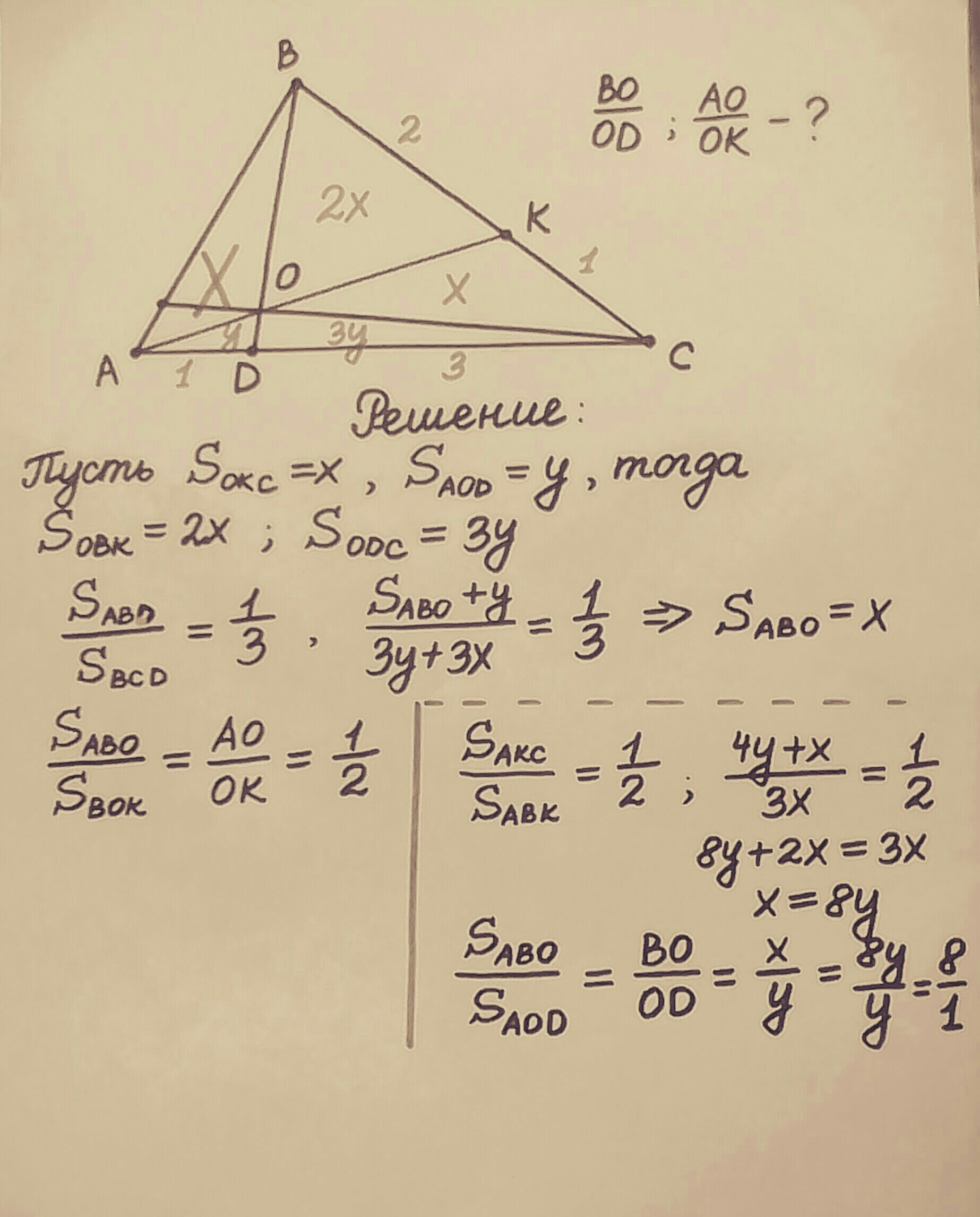 Точка K лежит на стороне BC треугольника ABC точка D на стороне AC при этом BK/KC=2/1 и AD/DC=1/3. Отрезки AK И BD пересекаются в точке O. Чему равно отношение BO/OD и AO/OK