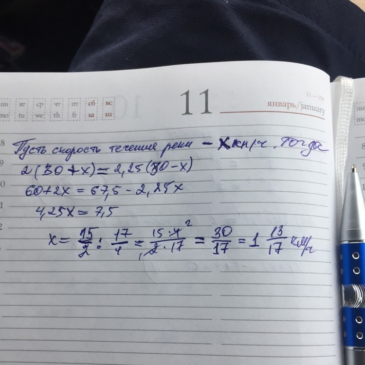 Катер на подводных крыльях, двигаясь по течению реки, за 2 ч проходит такое же расстояние, какое он проходил за 2 ч 15 мин против течения. Чему равна собственная скорость катера, если скорость катера 30 км/ч?