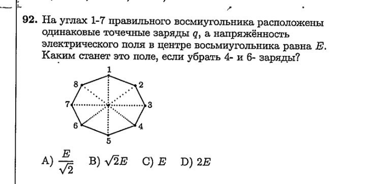 В первоначальной конфигурации нескомпенсированным является лишь 4-й заряд ввиду отсутствия заряда в точке 8. Именно 4-й заряд создаёт в центре восьмиугольника поле напряжённостью Е. Такое же поле создаёт каждый из семи зарядов в отдельности.