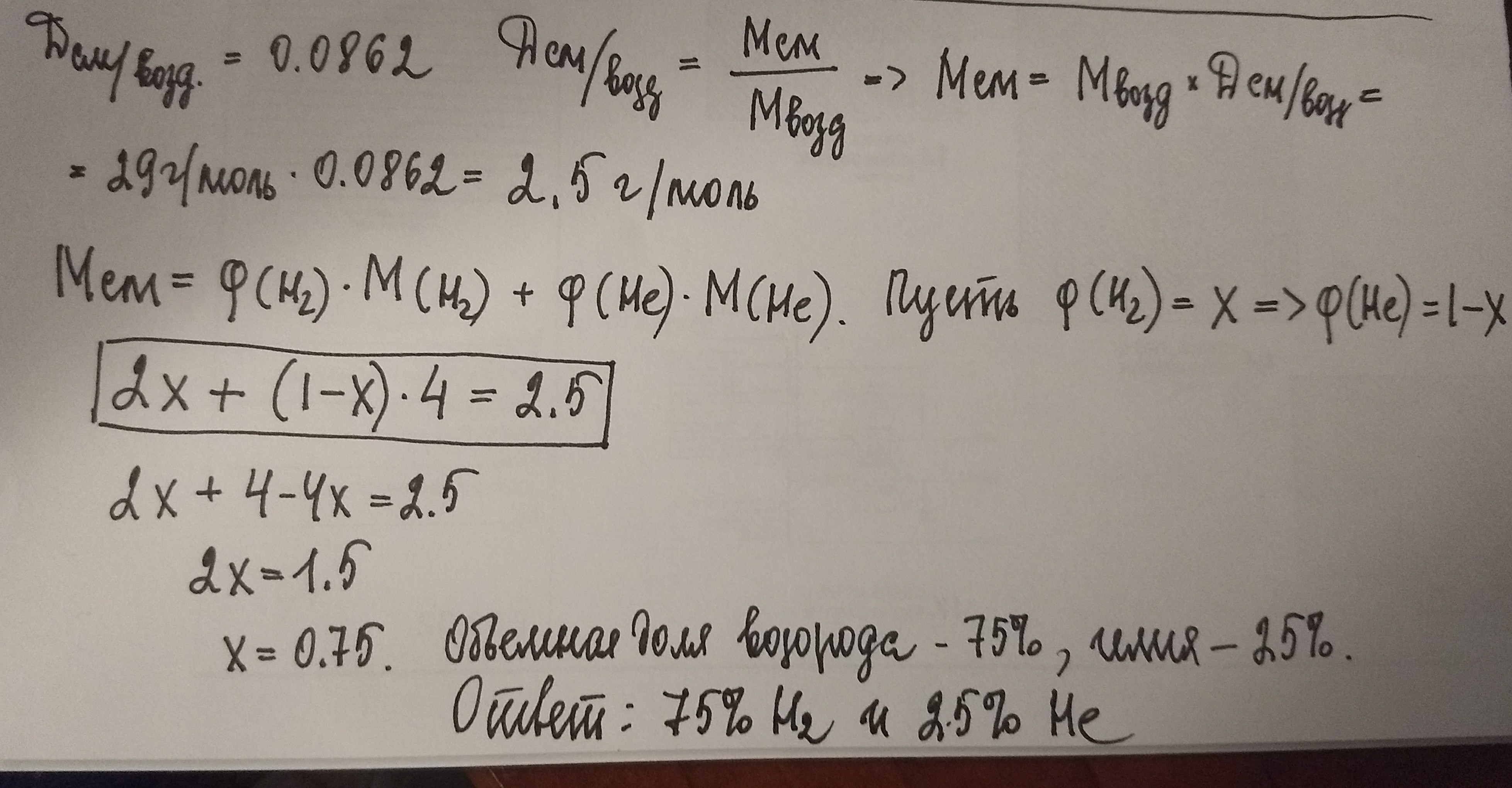 Средняя плотность по воздуху газовой смеси , состоящей из водорода и гелия, равна 0,0862.Вычислите объёмные доли гелия и водорода в смеси.