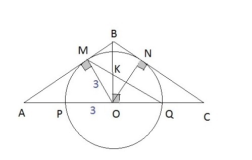 окружность радиуса 3 с центром на основании равнобедренного треугольника касается его боковых сторон. одну из точек касания соединили отрезком с противолежащей вершиной основания.этот отрезок делится высотой треугольника проведенной к основанию, в отношении 7:6, считая от вершины. найдите площадь треугольника