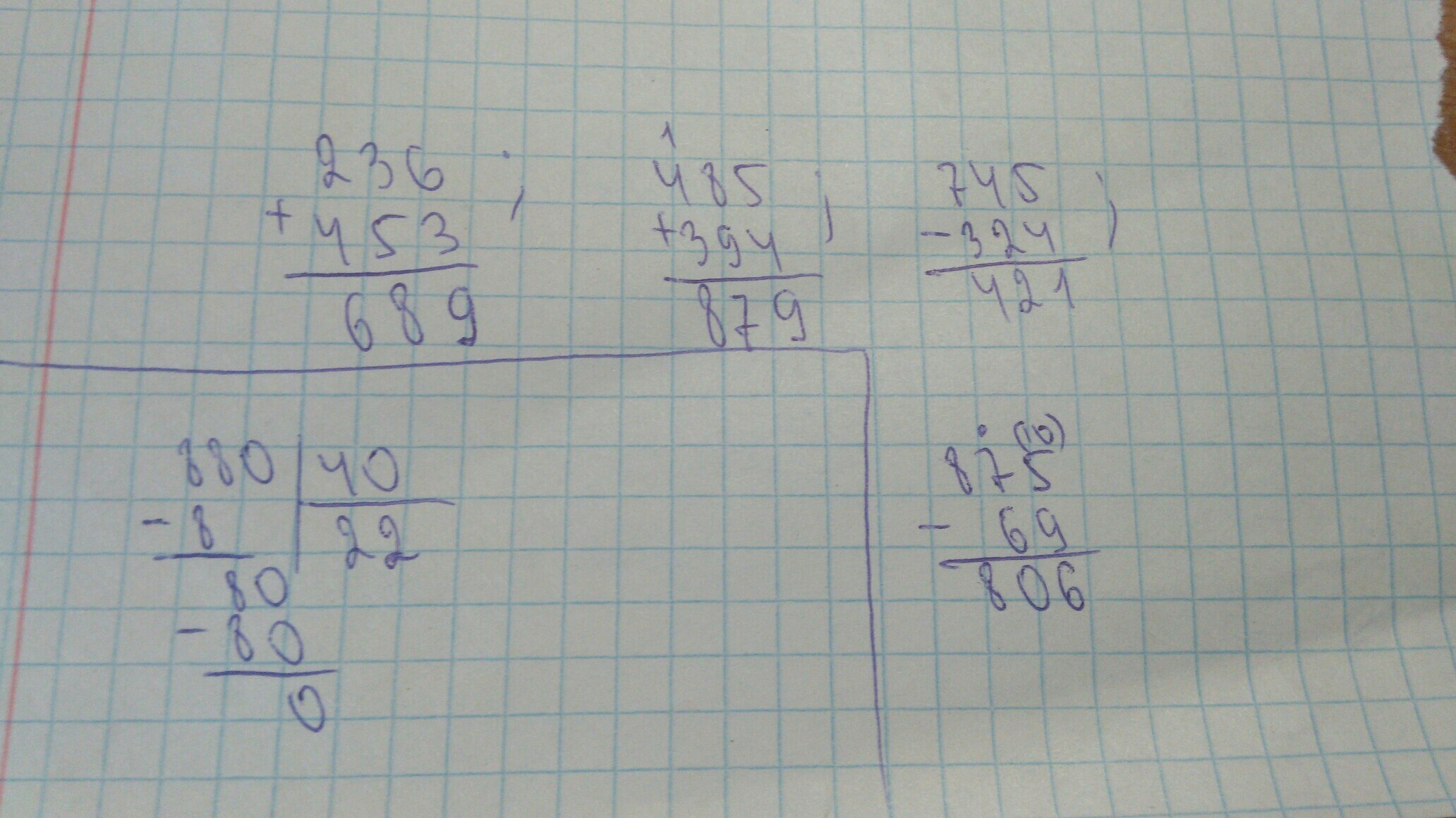 На фото - решения примеров в столбик, а также показано деление 880 на 40 ( из задания, где надо решить уравнения ).