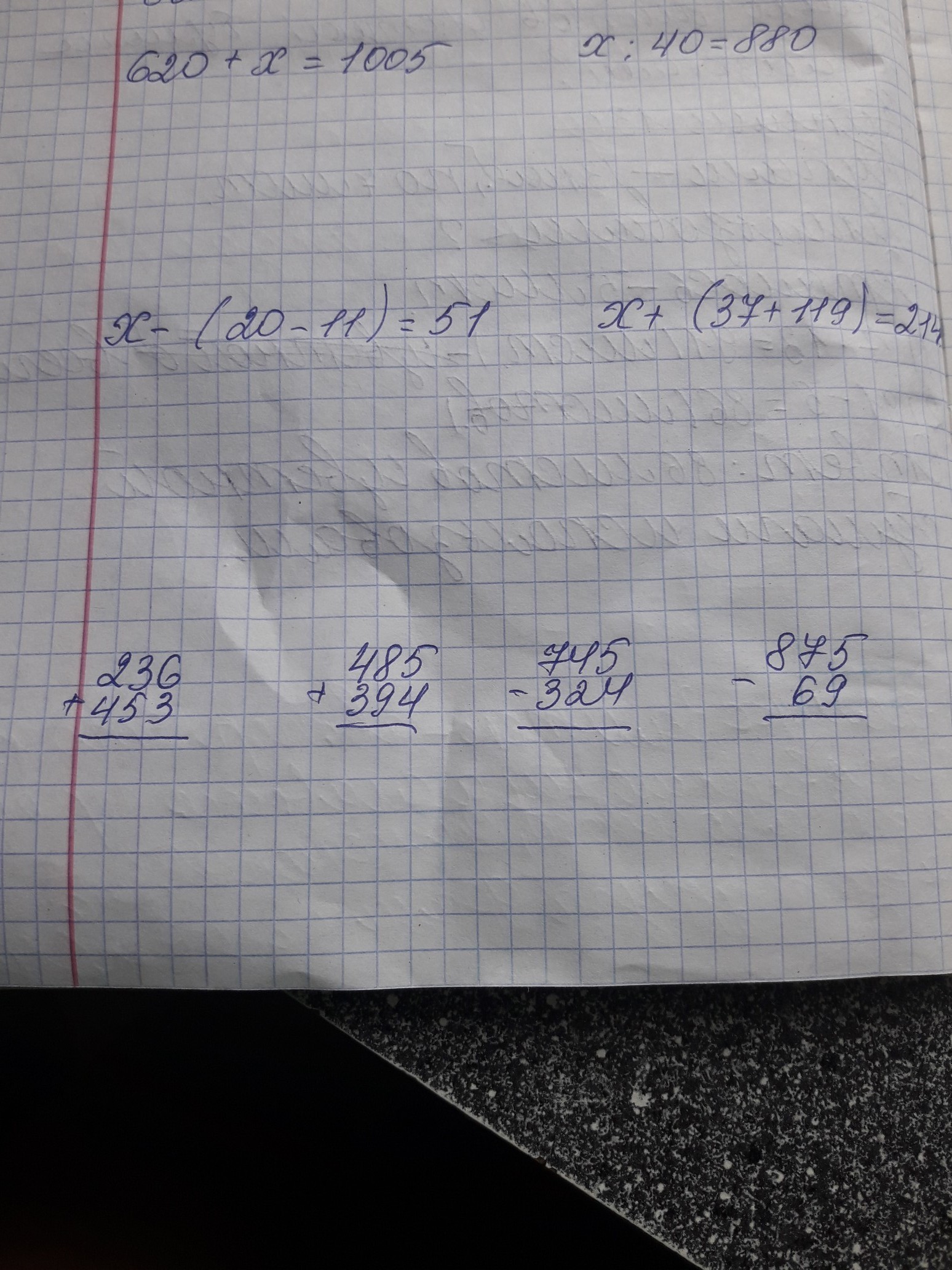 620+х=1005 х:40=880 х-(20-11)=51 х+(37+119)=214