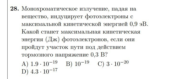 Электрическое поле выполняет работу А = eU, которая по модулю равна изменению кинетической энергии Е₁ - Е₂. Имеем равенство eU = Е₁ - Е₂, отсюда Е₂ = Е₁ - eU = 0,9 эВ - 0,3 эВ = 0,6 эВ = 0,6*1,6*10⁻¹⁹ Дж = 0,96 * 10⁻¹⁹ Дж. Ответ: 0,96 * 10⁻¹⁹ Дж.