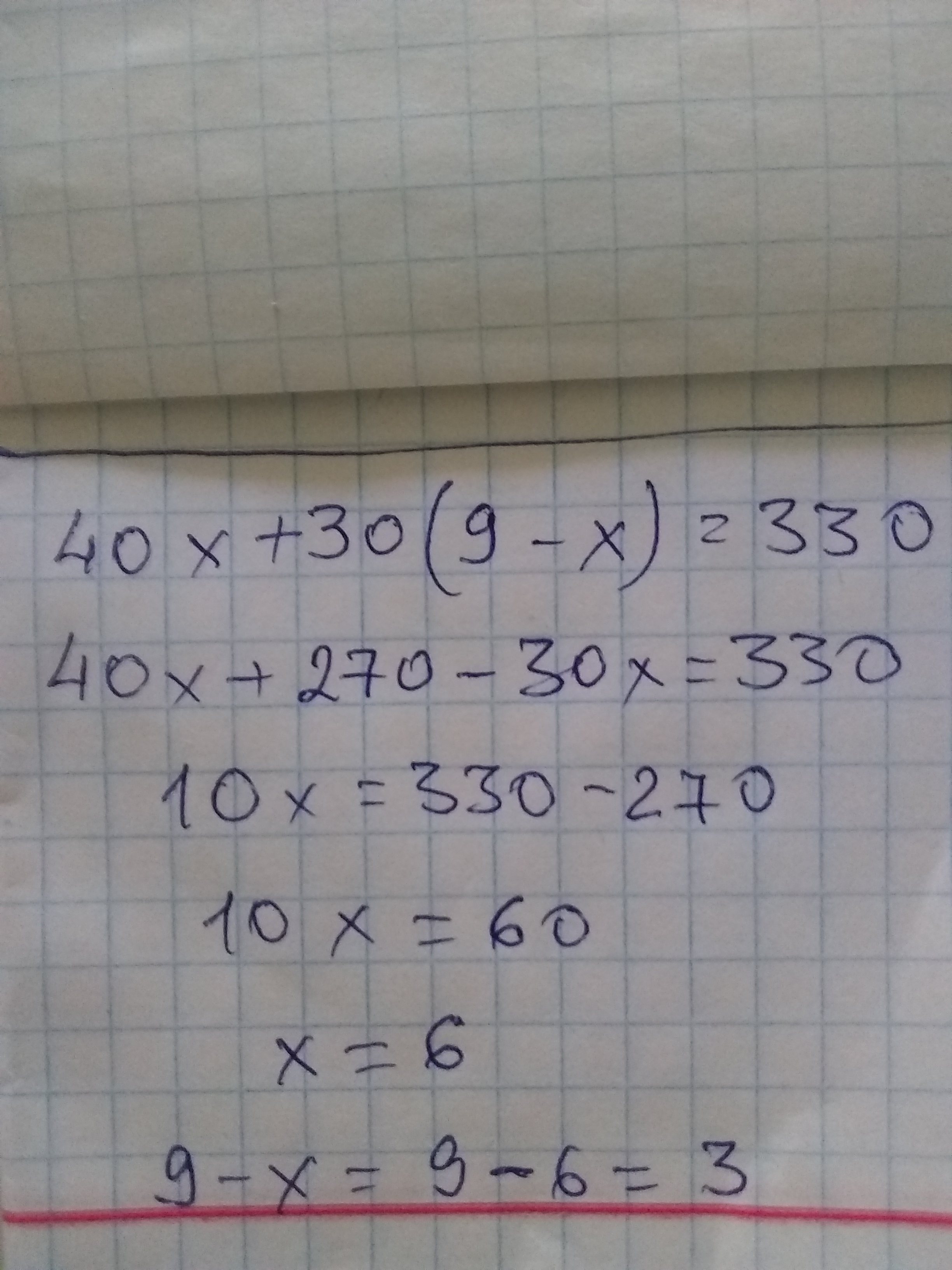 Купили 9 м тканини двох сортів ціною по 40 грн за метр і 30 грн . За всю покупку заплатили 330 грн Скільки купили тканини кожного сорту?