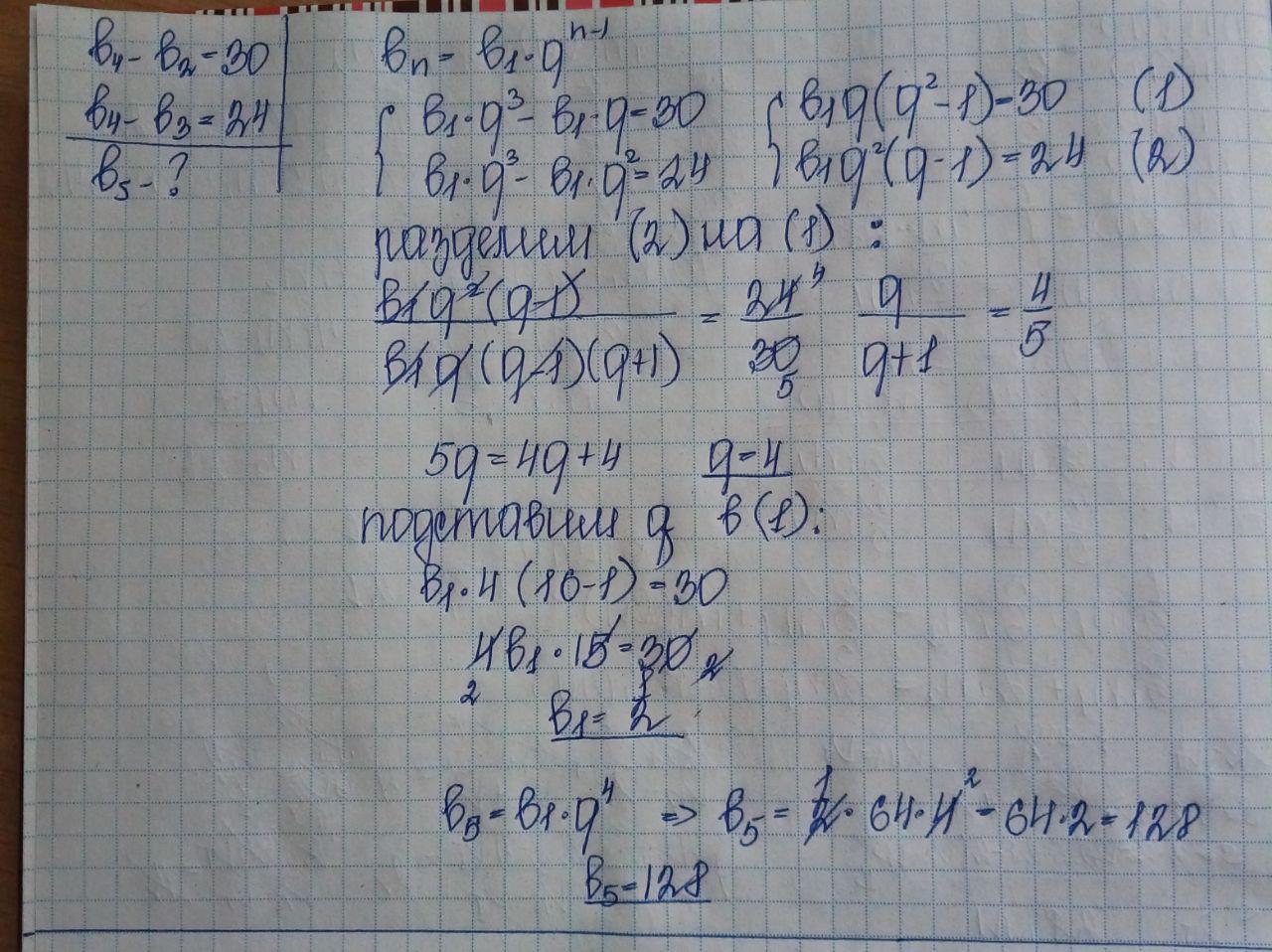 Різниця четвертого і другого членів геометричної прогресії дорівнює 30, а різниця четвертого і третього становить 24. Знайти п'ятий член геометричної прогресії.