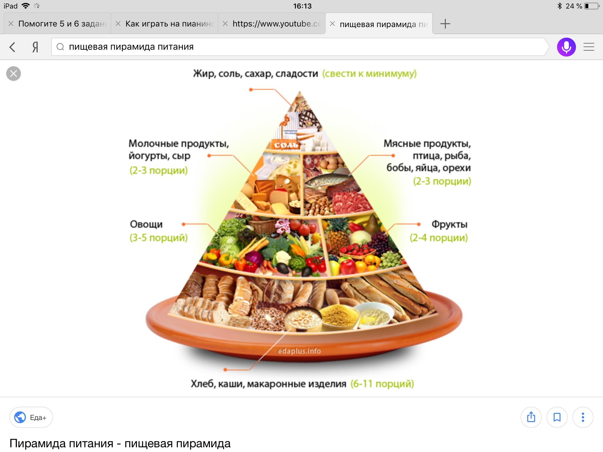 6. Пирами́да пита́ния или пищева́я пирами́да — схематическое изображение принципов здорового питания, разработанных диетологам. Тут ты должен составить свою ну и к примеру моя это :