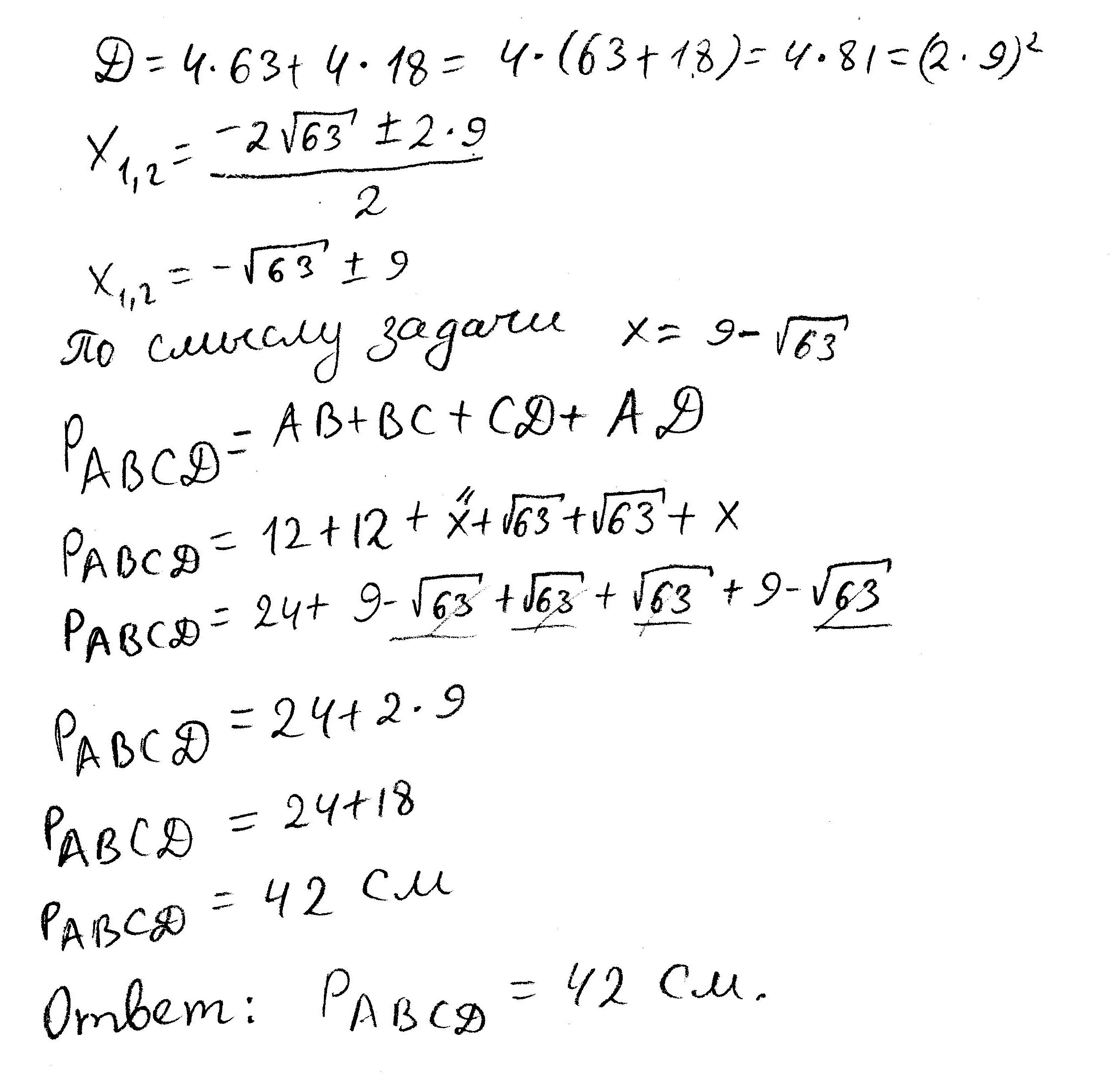 2( х + 3√7 )² = 81 + ( х + 3√7 )² ; ( х + 3√7 )² = 81 ; х + 3√7 = 9 ; х = 9 - 3√7 ; Периметр трапеции равен: 9 - 3√7 + 9 - 3√7 + 6√7 + 24 = 18 + 24 = 42...