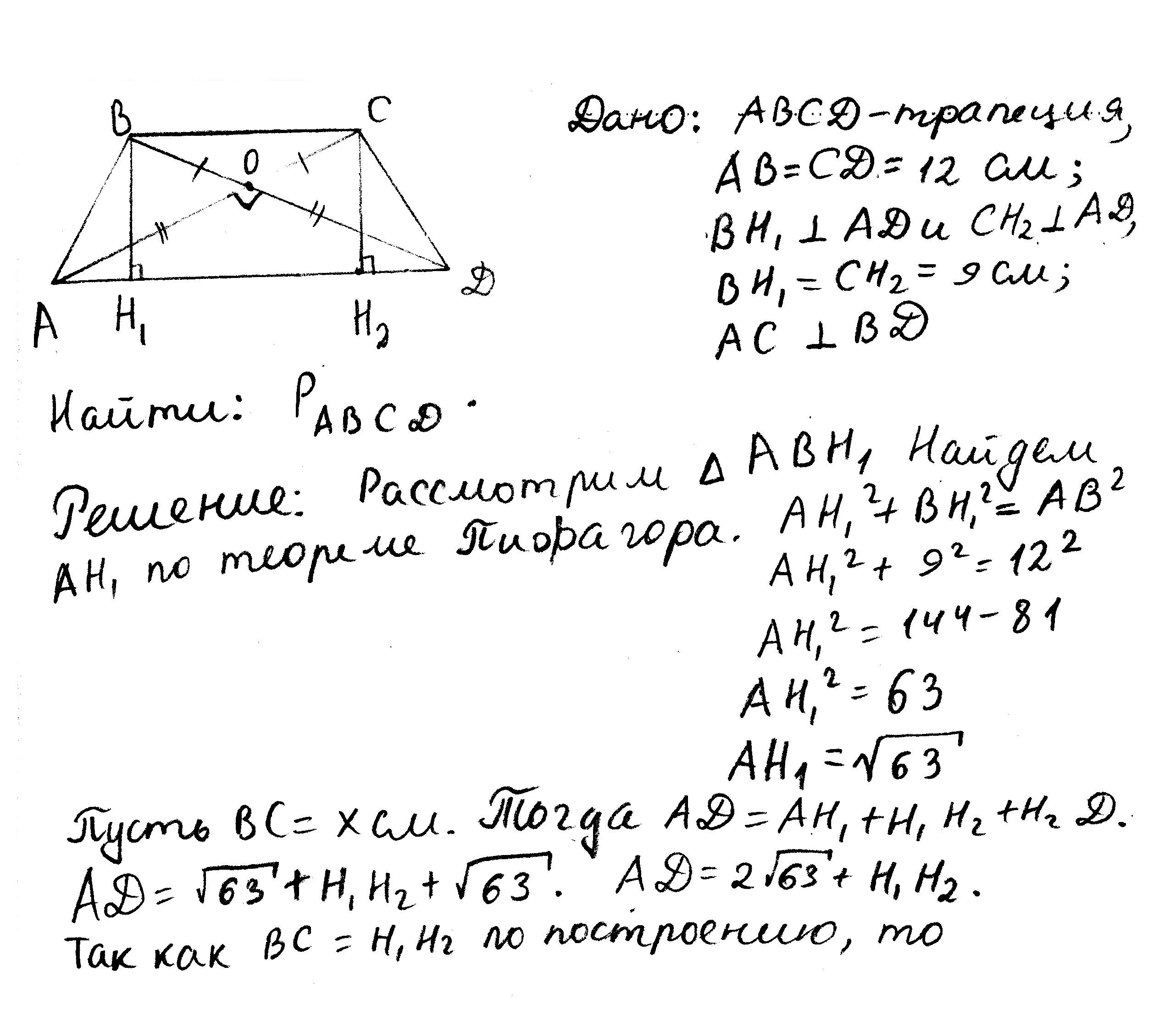 Второй способ: дополнительно построить СЕ параллельно диагонали ВD. Пусть ВС = х , тогда BC = H1H2 = DE = x . Диагонали равнобедренной трапеции перпендикулярны и равны => ВD || CE => АС перпендикулярен СЕ . Рассмотрим ∆ АСЕ: По теореме Пифагора: АС² + СЕ² = АЕ² ; 2АС² = ( 2х + 6√7 )² ; 2АС² = 4( х + 3√7 )² ; АС² = 2( х + 3√7 )² . Рассмотрим ∆ СН2Е: По теореме Пифагора: СЕ² = СН² + Н2Е² ; СЕ² = 81 + ( х + 3√7 )² . Так как АС = СЕ , приравняем эти правые части =>