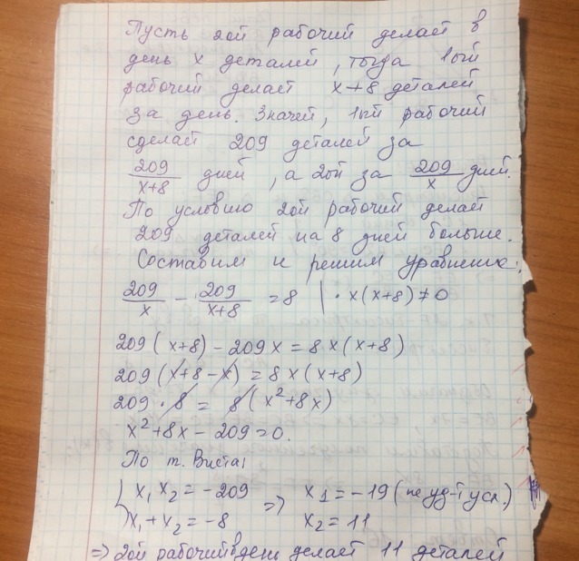 первый рабочий делает в день на 8 деталей больше чем второй. Сколько деталей в день делает второй рабочий, если известно ,что 209 деталей он делает на 8 дней дольше , чем первый.