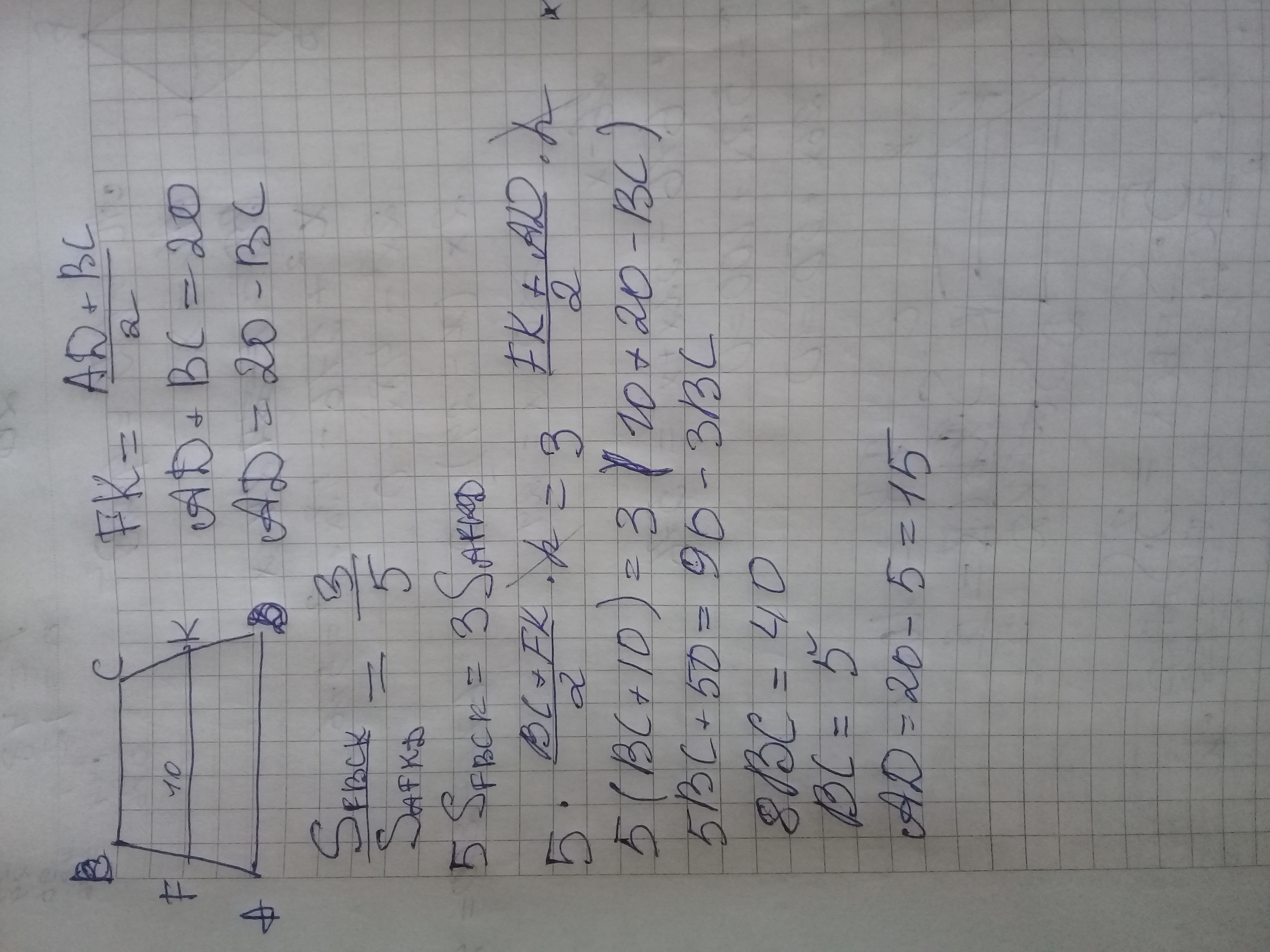 средняя линия трапеции равна 10 см и делит площадь трапеции в отношении 3:5 . найдите длины оснований этой трапеции. !!