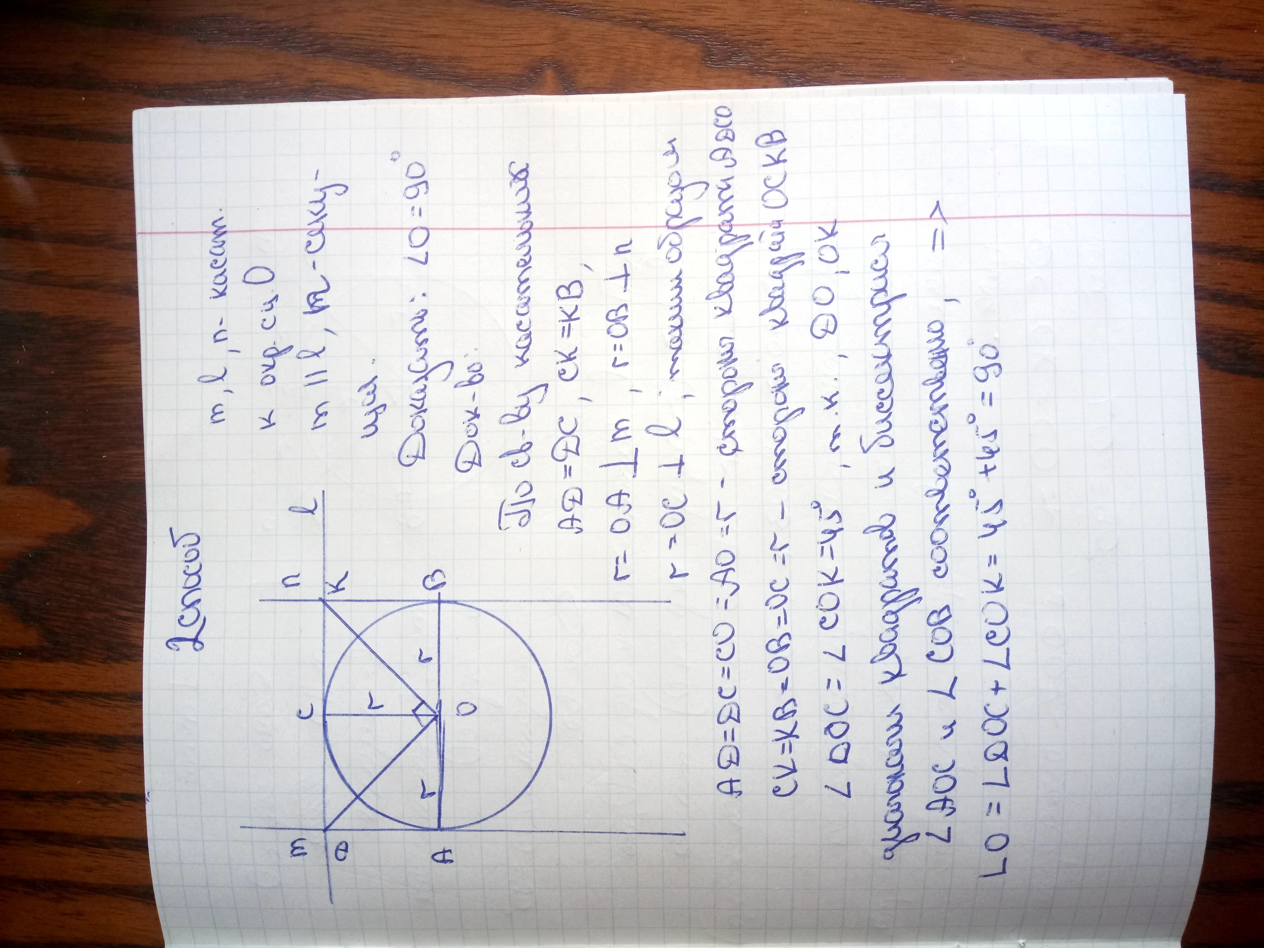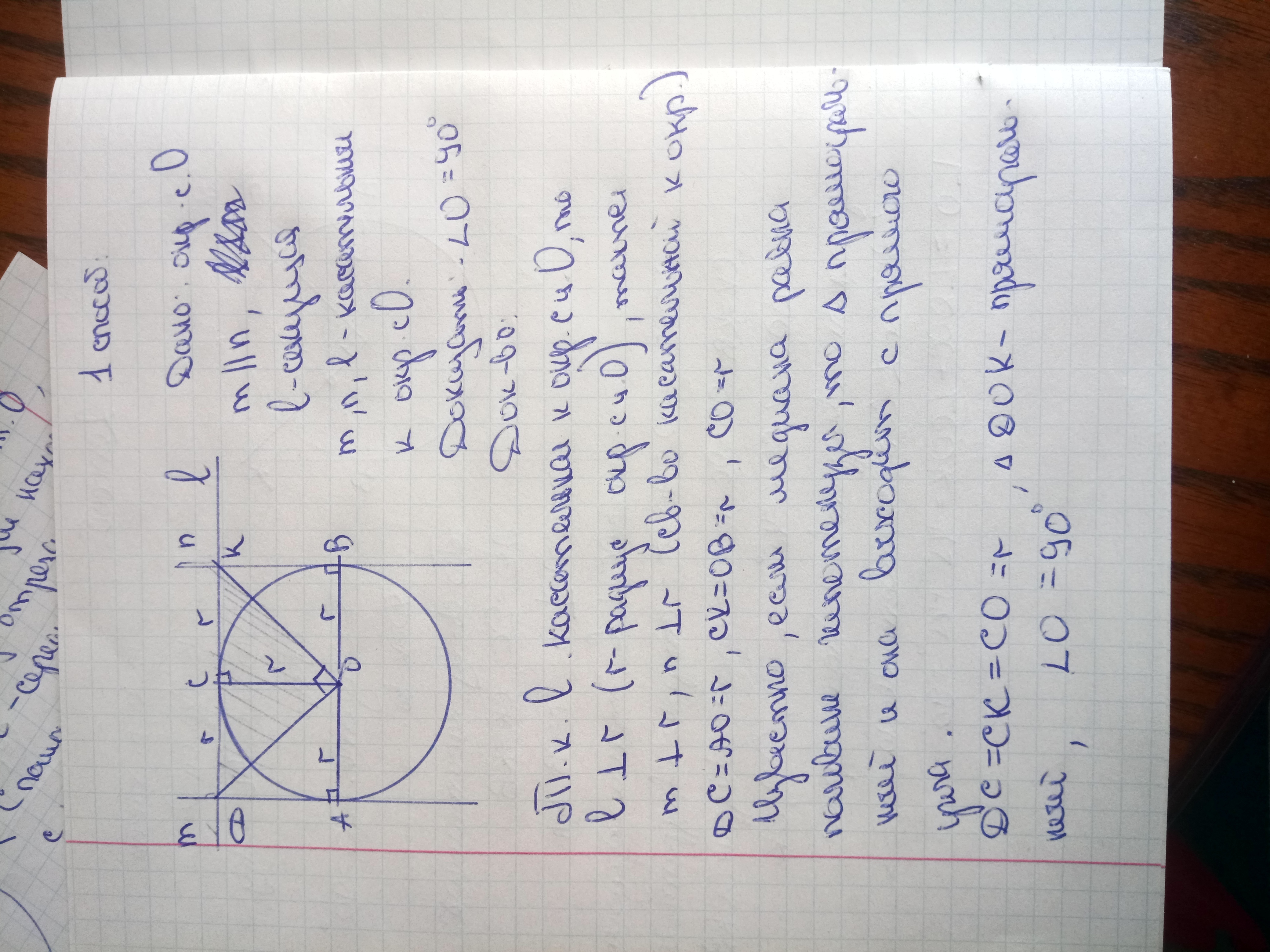 Окружность касается двух параллельных прямых и их секущей. Докажите, что отрезок секущей, заключенный между параллельными прямыми, виден из центра окружности под прямым углом.