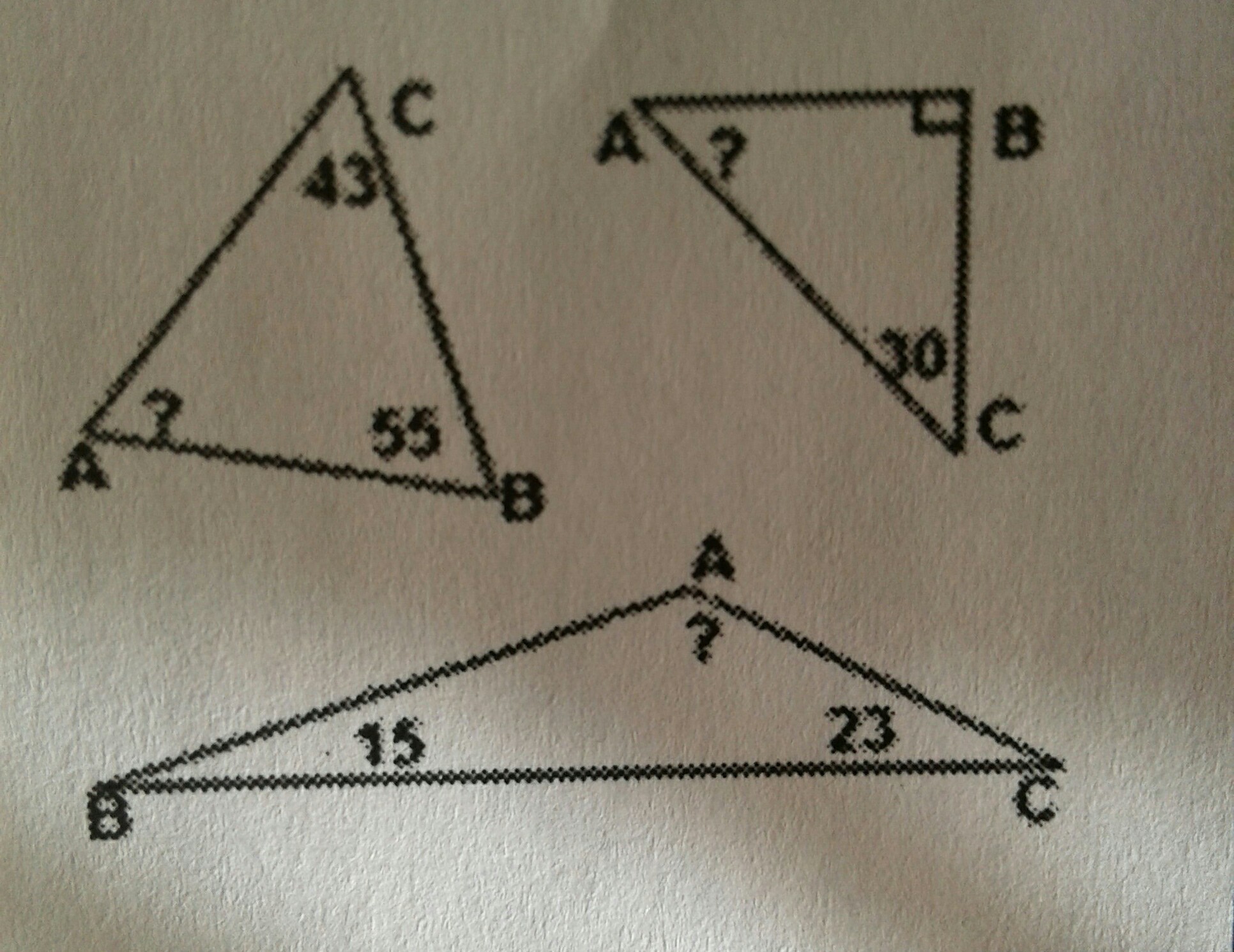 сумма углов любого треугольника 180 градусов то есть на всех рисунках угол A;уголB;уголC=180 градусов нйди значение угла A используя данные приведенные на чертежах