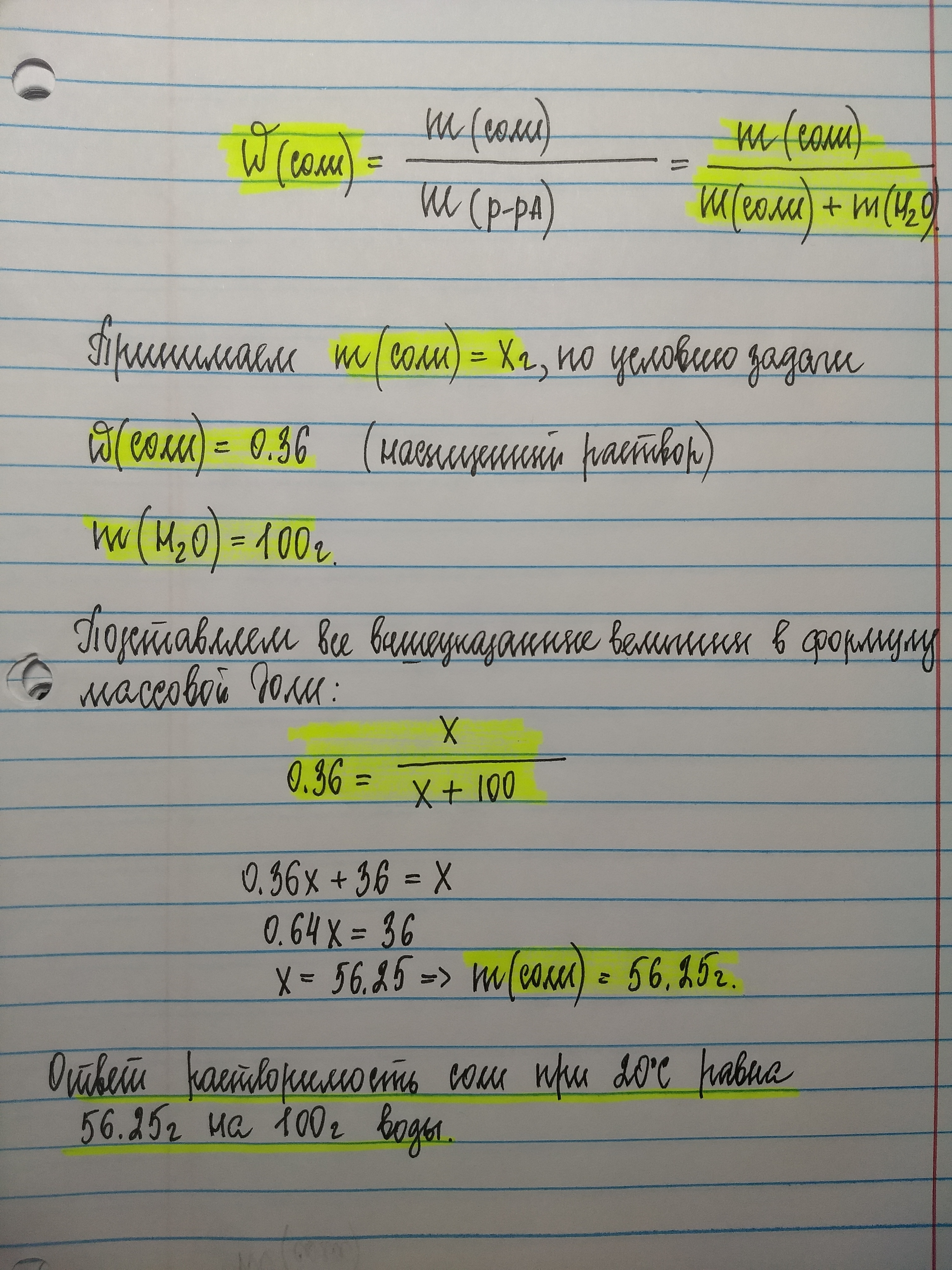 Массовая доля насыщенного раствора при 20°C равна 0,36. Определите растворимость соли ( на 100 г воды ) при данной температуре.