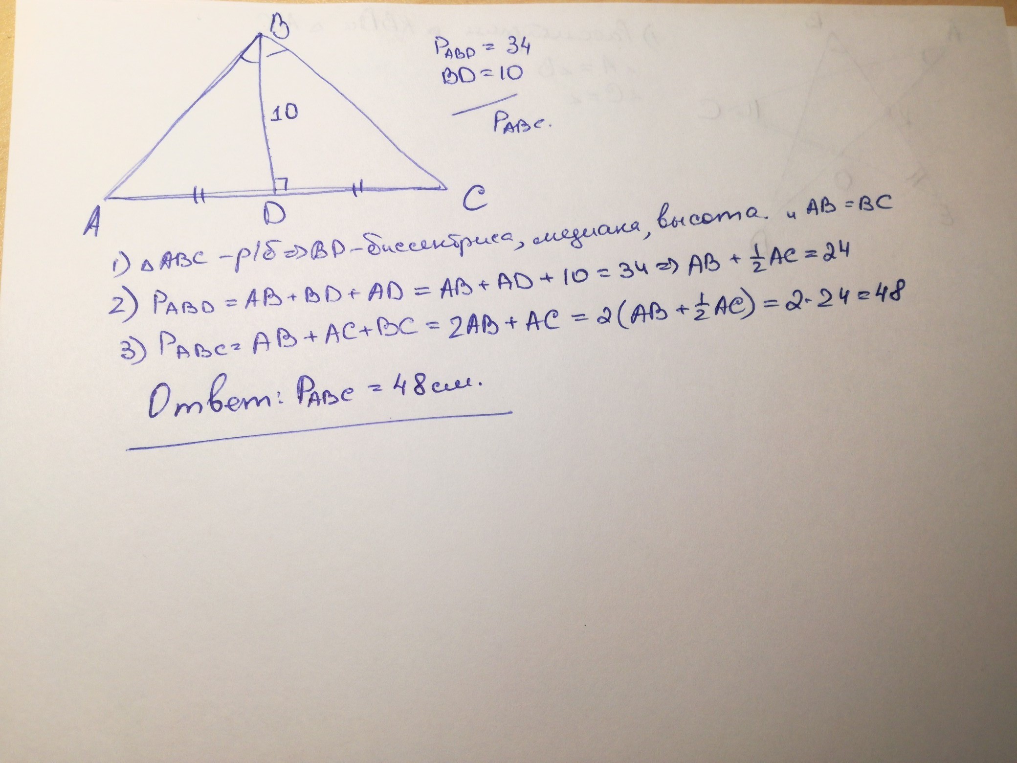В равнобедренном треугольнике АВС с основанием АС проведена биссектриса ВD, равной 10 см. Периметр треугольника АВD равна 34 см. Чему равна периметр ΔАВС?