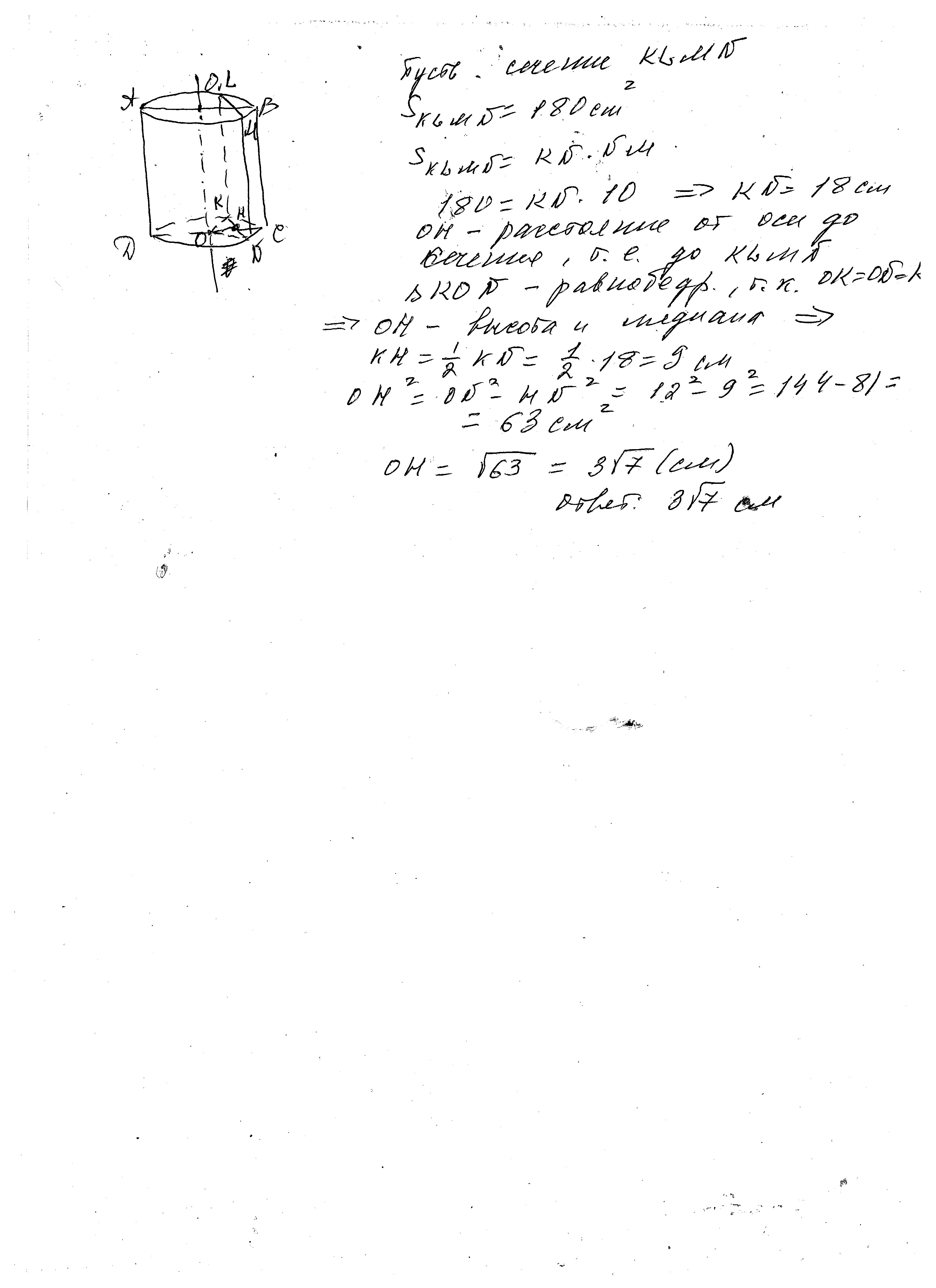 Площадь стечения цилиндра плоскостью параллельной оси равна 180см^2, высота цилиндра=10см,радиус основания равен 12см. Найти расстояние от оси цилиндра плоскости сечения. Площадь стечения цилиндра плоскостью параллельной оси равна 180см^2, высота цилиндра=10см,радиус основания равен 12см. Найти расстояние от оси цилиндра плоскости сечения.