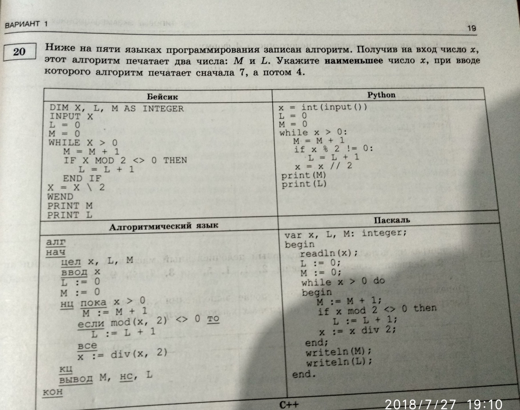 Что бы найти минимальное число при котором напечатается 7 и 4, можно число x представить в двоичном формате, тогда M самому левому разряду в двоичном числе, а L равно количеству единиц в двоичной записи. Значит минимальное число будет