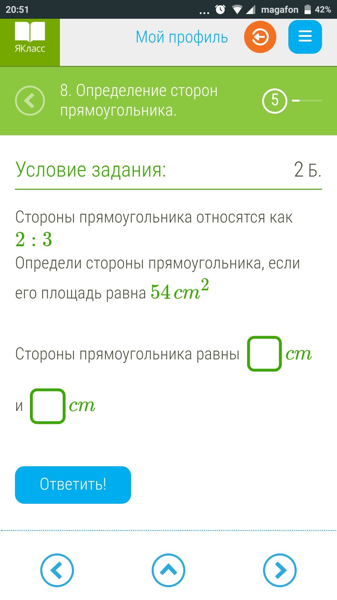 Пусть одна сторона 2х, тогда вторая сторона - 3х. Т.к. 6x^2=54, то x=3, тогда одна сторона равна 6, другая 9