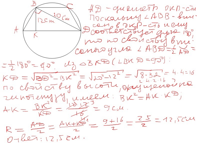 Центр окружности, описанной вокруг равносторонней трапеции, лежит на ее большей основе. Найдите радиус круга, если диагональ трапеции равна 20 см, а ее высота - 12 см.